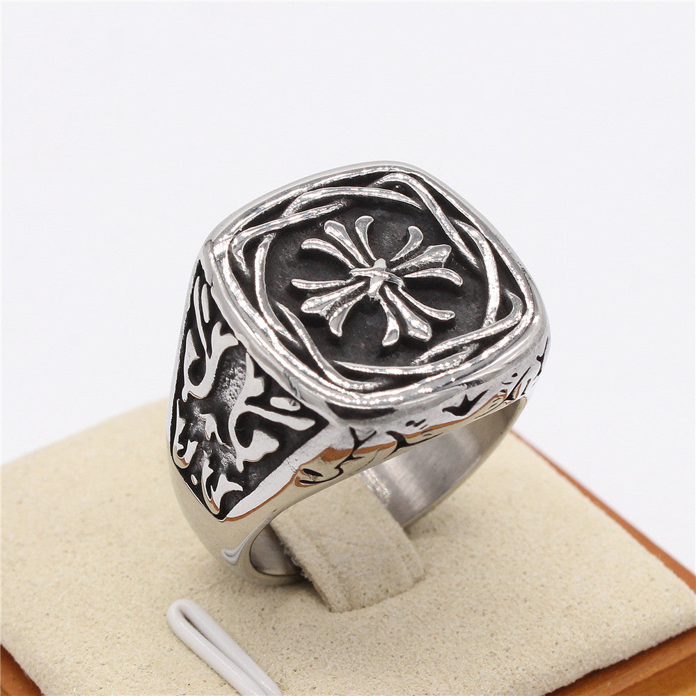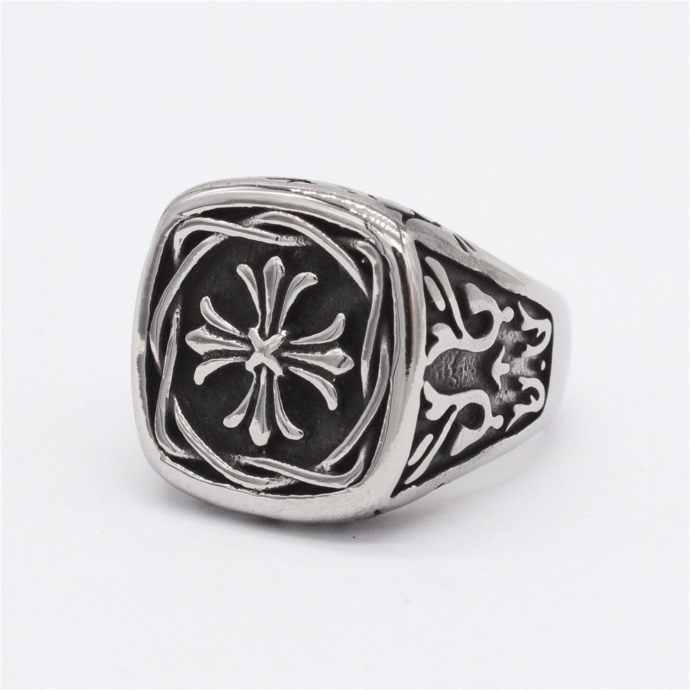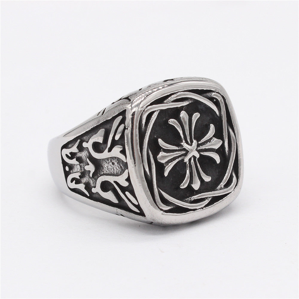 This retro-inspired titanium steel ring features a bold design with a cross flower pattern in the center. The durable finish and classic square shape make this an eye-catching piece for any man's wardrobe.