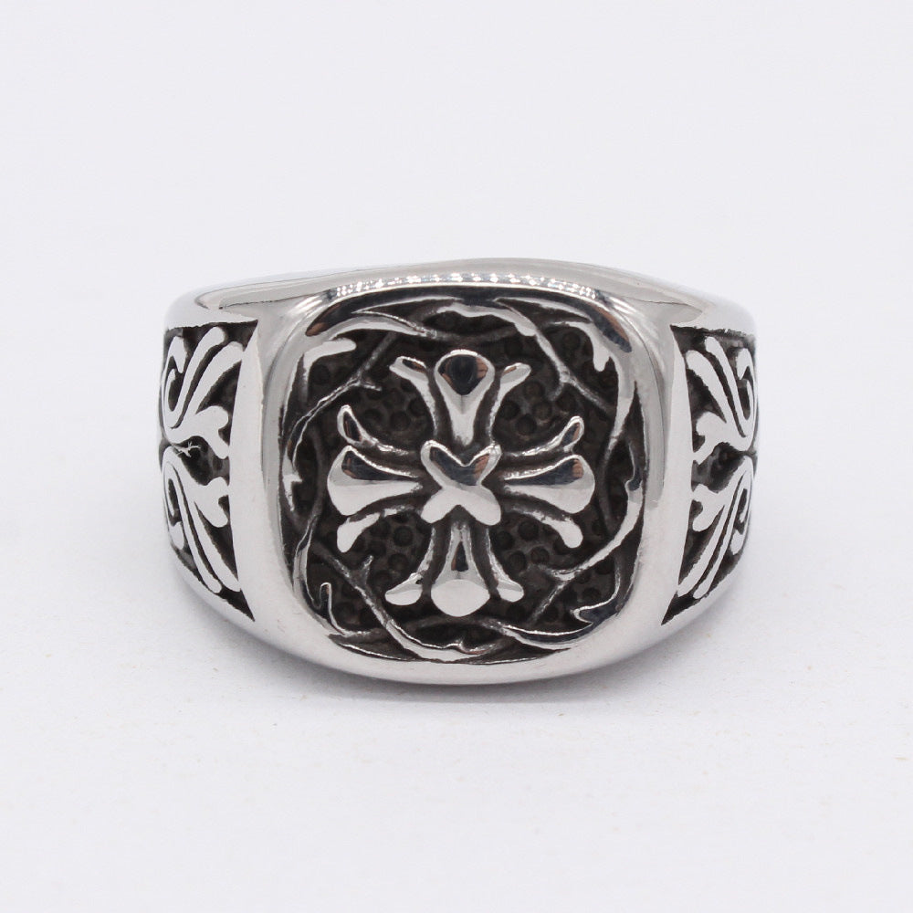 This modern ring for men is perfect for adding a touch of style to any look. Crafted from titanium steel for durability. it features a square shape and is adorned with a relief cross flower for an eye-catching detail.
