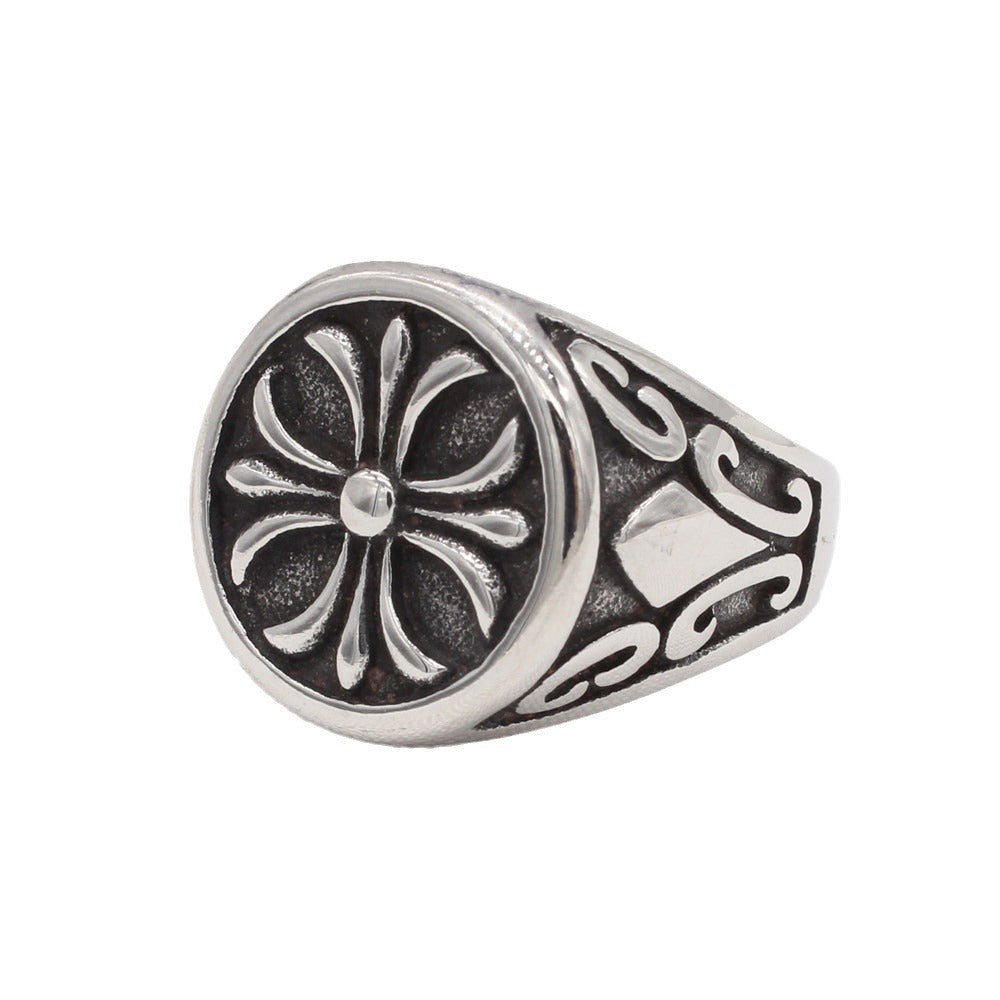 This Vintage Punk men's ring is made from durable titanium steel for long-lasting style. The round disk is decorated with a bold cross flower pattern. offering a unique look that stands out. Wear this ring for a stylish touch to any outfit.