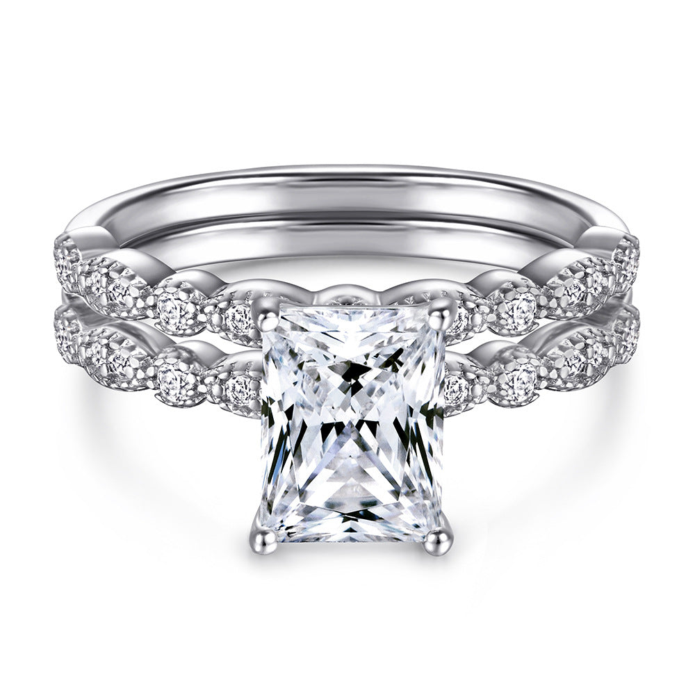 This Radiant Cut Zircon with Beading Silver Ring Set features the Marquise shaped ring arm decorate with small zircons. and one ring features a Radiant Cut Zircon as the main stone. The perfect choice for imbuing an outfit with subtle sophistication.