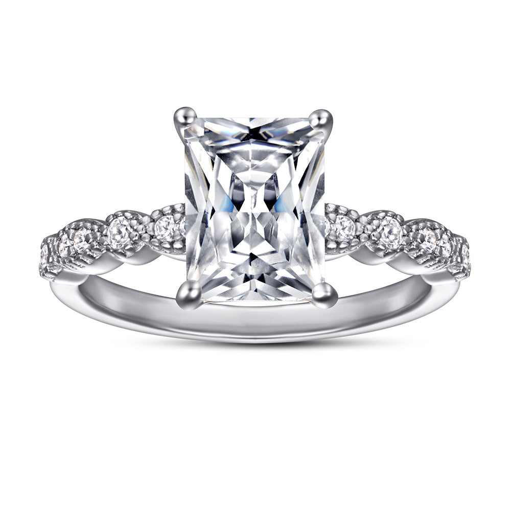 This Radiant Cut Zircon Four Prongs Cathedral style Silver Ring boasts spectacular sparkle. The four prongs securely hold the radiant cut zircon in center. the marquise shape ring arm is decorated with small zircons for added brilliance. Complementing any outfit. this beautiful ring will be sure to turn heads.
