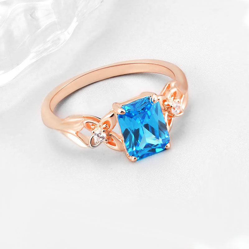 This elegant silver ring for women features an 8 x 6 mm rectangle blue zircon for a sophisticated and captivating look. The gemstone is expertly cut for a dazzling finish. Crafted in sterling silver plated in rose gold. this ring is sure to catch every eye.