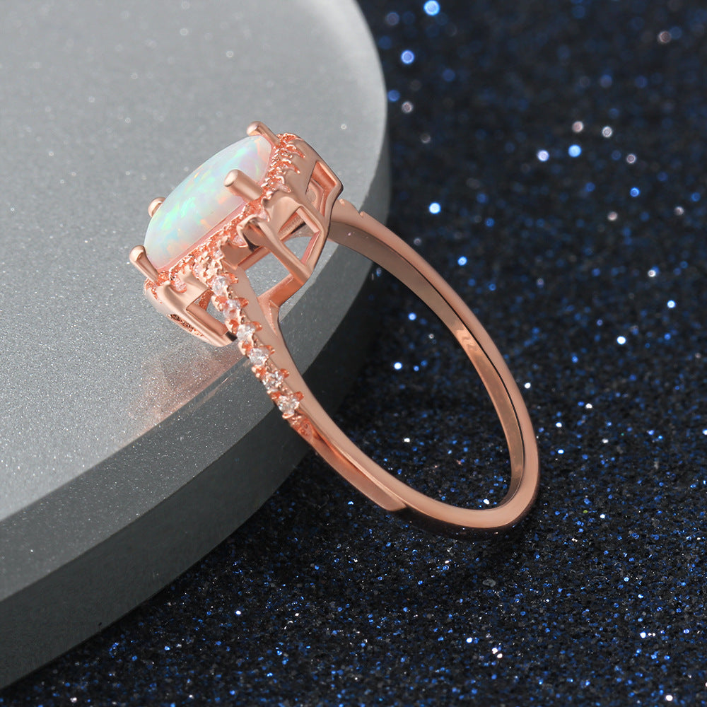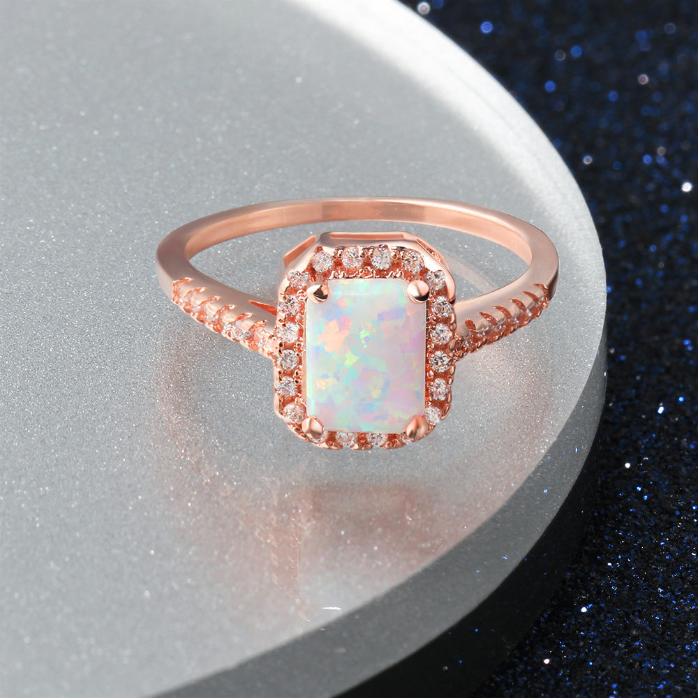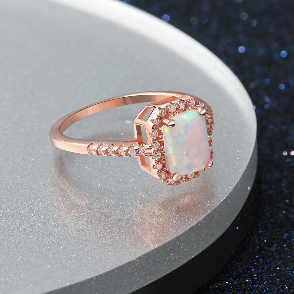 This stunning Rectangle Opal Zircon Soleste Halo Rose Gold Sterling Silver Ring features a rectangle opal centerpiece surrounded by a halo of zircon solestes. Crafted with sterling silver and plated in rose gold. this beautiful ring is the perfect statement piece. Its timeless design will make you shine!