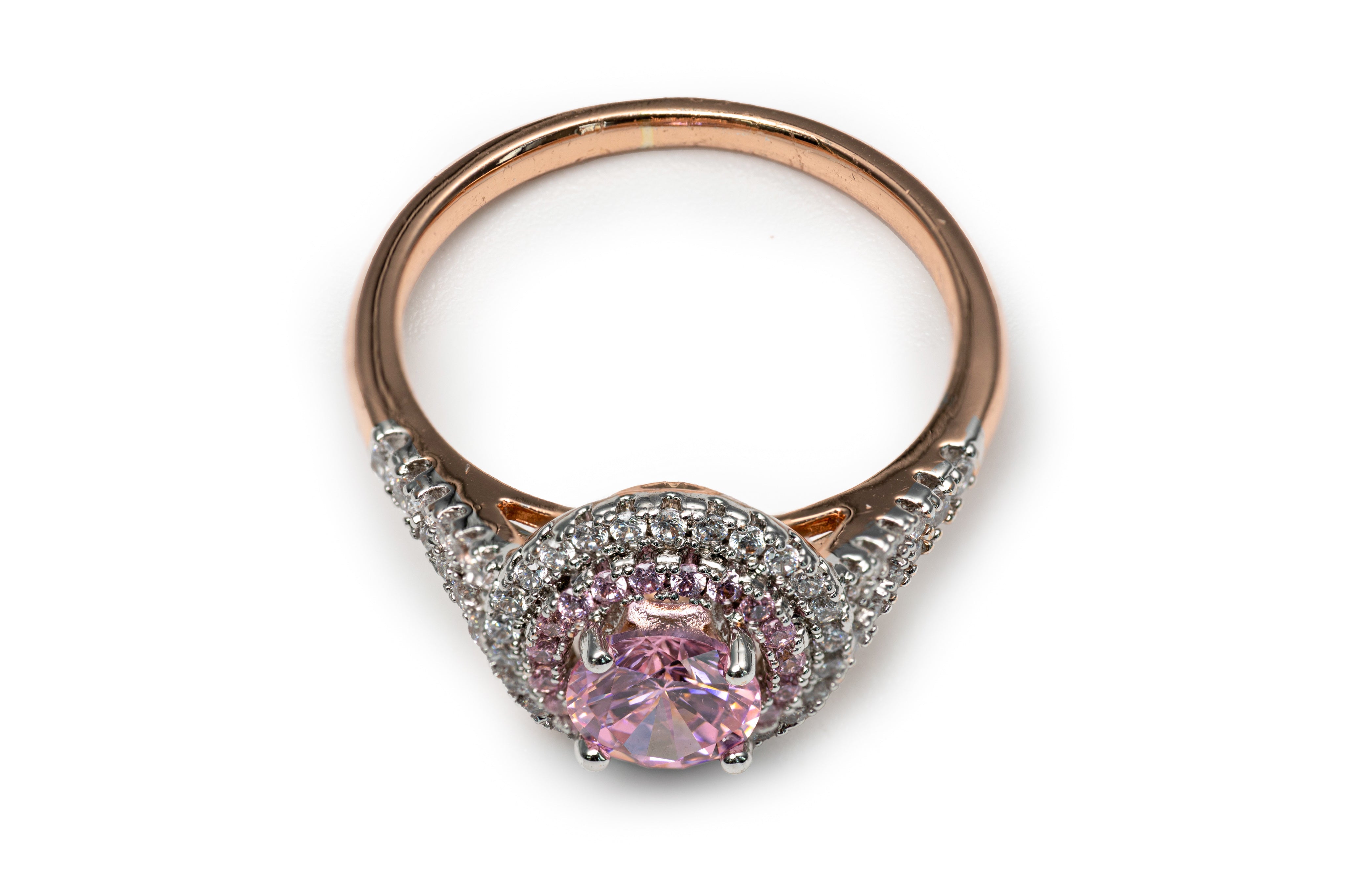 This stylishly designed Rosé Gypsophila Paniculatal Ring is perfect for adding a touch of modern elegance to any outfit. The Purple round Zircon center stone is framed and enhanced by a double Soleste halo and small zircon accents on the ring arm. creating a truly unforgettable look.
