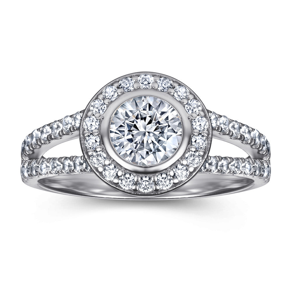 This unique and contemporary Round Zircon Soleste Halo Modern Split Shank Silver Ring dazzles with its round Zircon with Soleste Halo. Its eye-catching split shank ring arm is decorated with small Zircons. creating a stunning statement piece.