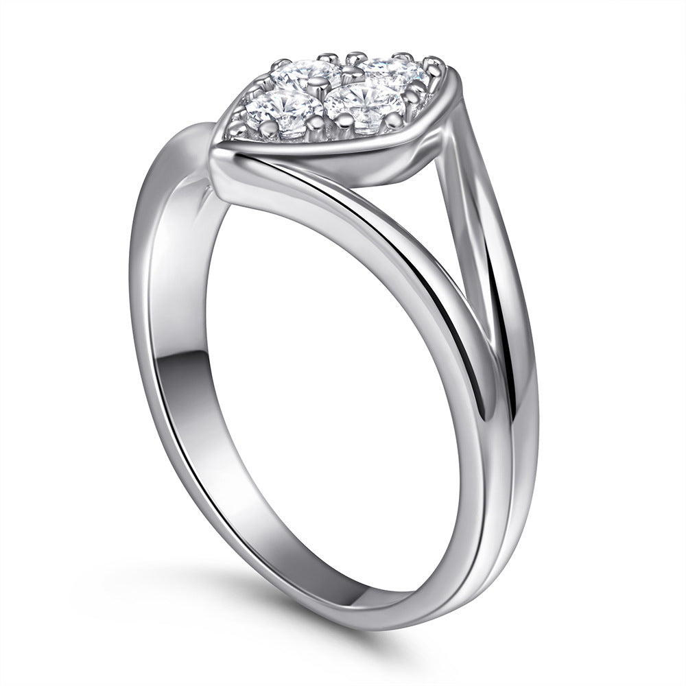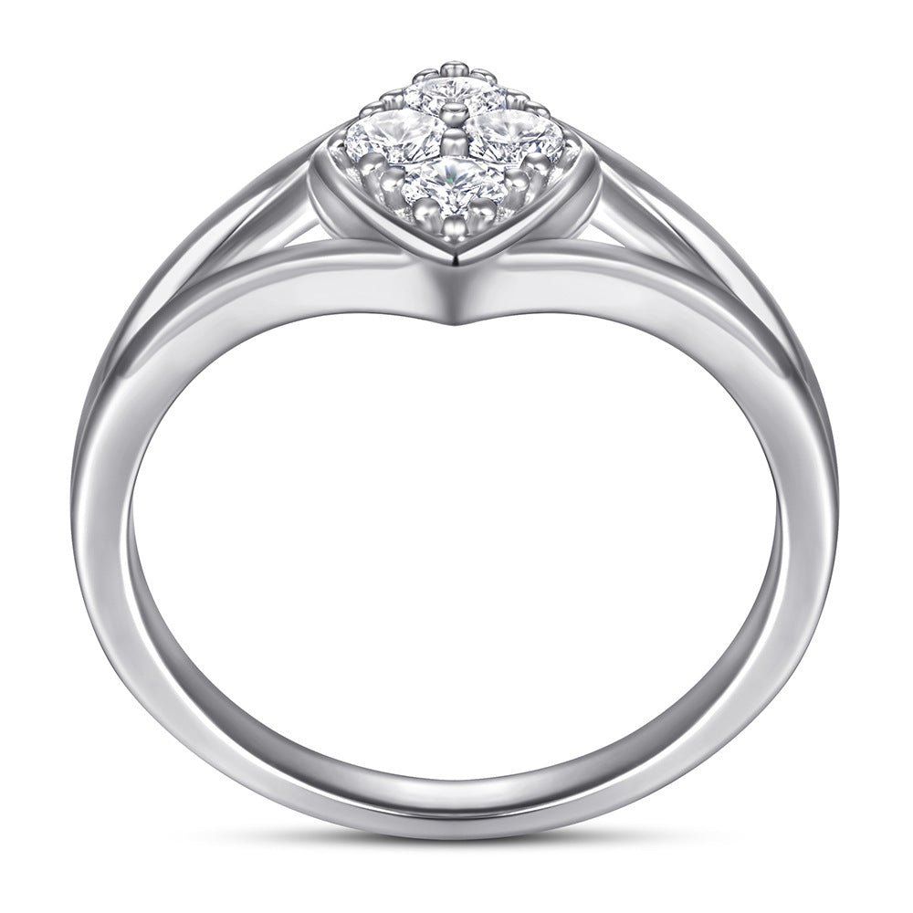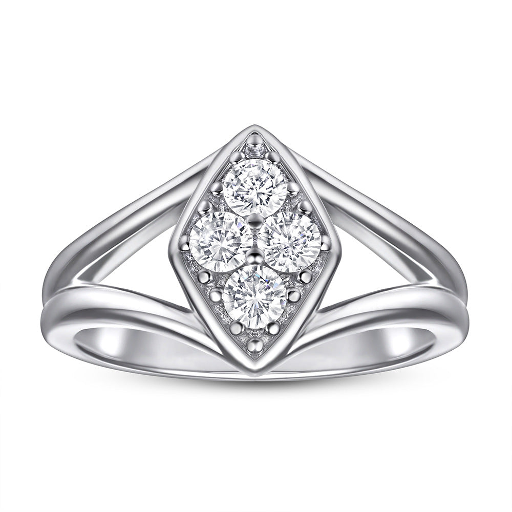 Accentuate your look with this elegant Modern Split Shank ring arm sterling Silver Ring featuring a Rhombus shape adorned with four dazzling Round Zircons. This statement piece is sure to enhance any ensemble.