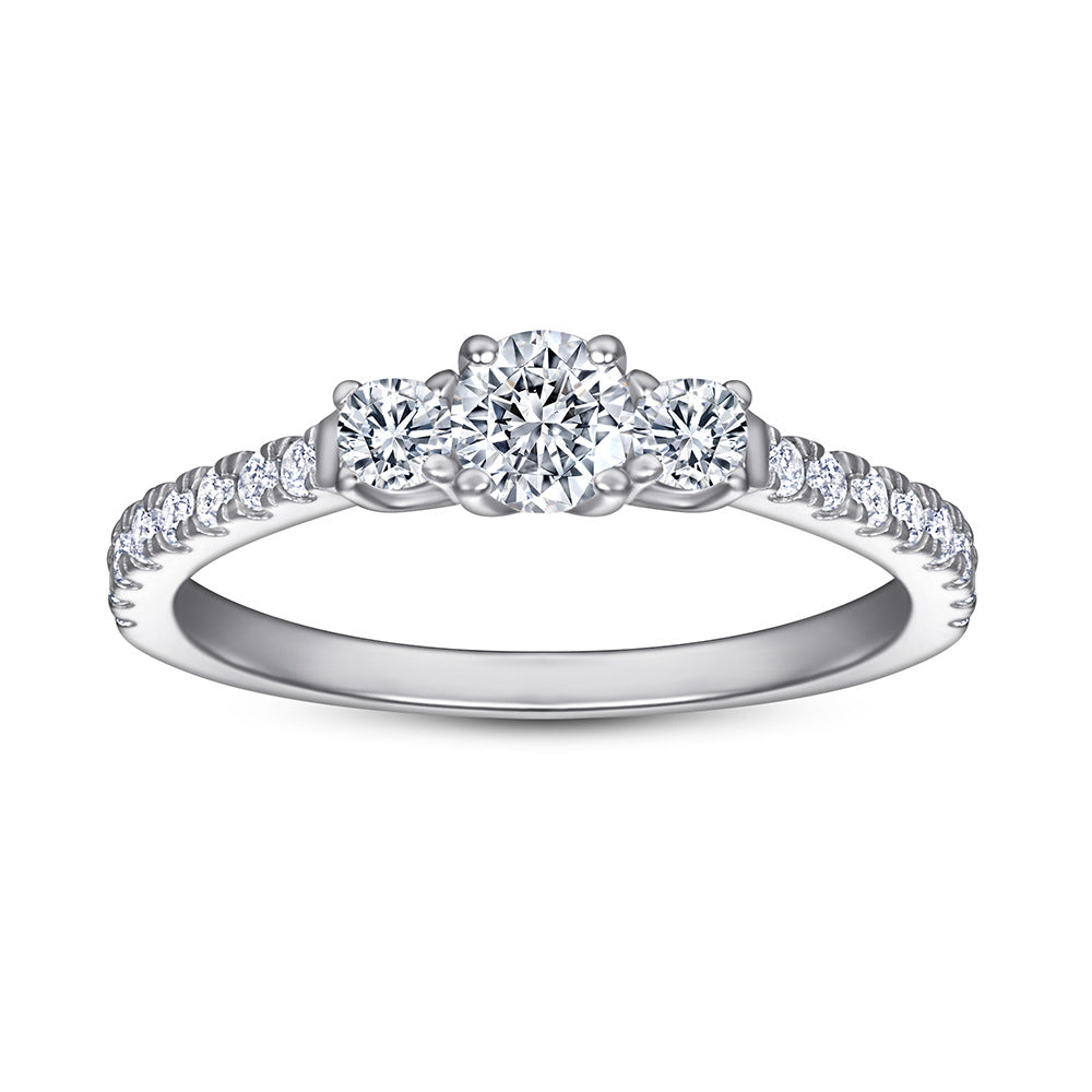 The Round Zircon Three-Stone Silver Ring celebrates the beauty of simplicity. The three dazzling round Zircons are set in sterling silver. complemented by smaller stones lining the arm of the ring. Expertly crafted. its stylish design highlights the quality of the Zircon while making a timeless statement.