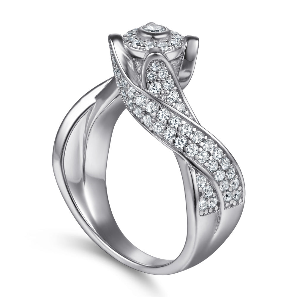 This Cathedral style Round Zircon and Interwoven Line Silver Ring is perfect for the sophisticated and modern style wearer. The Round Zircon with a halo is surrounded by tiny Zircons. and features a unique Interwoven Line ring arm decorated with small Zircons. adding an extra layer of glamour to the statement piece. Crafted from silver. this ring is ideal for special occasions.