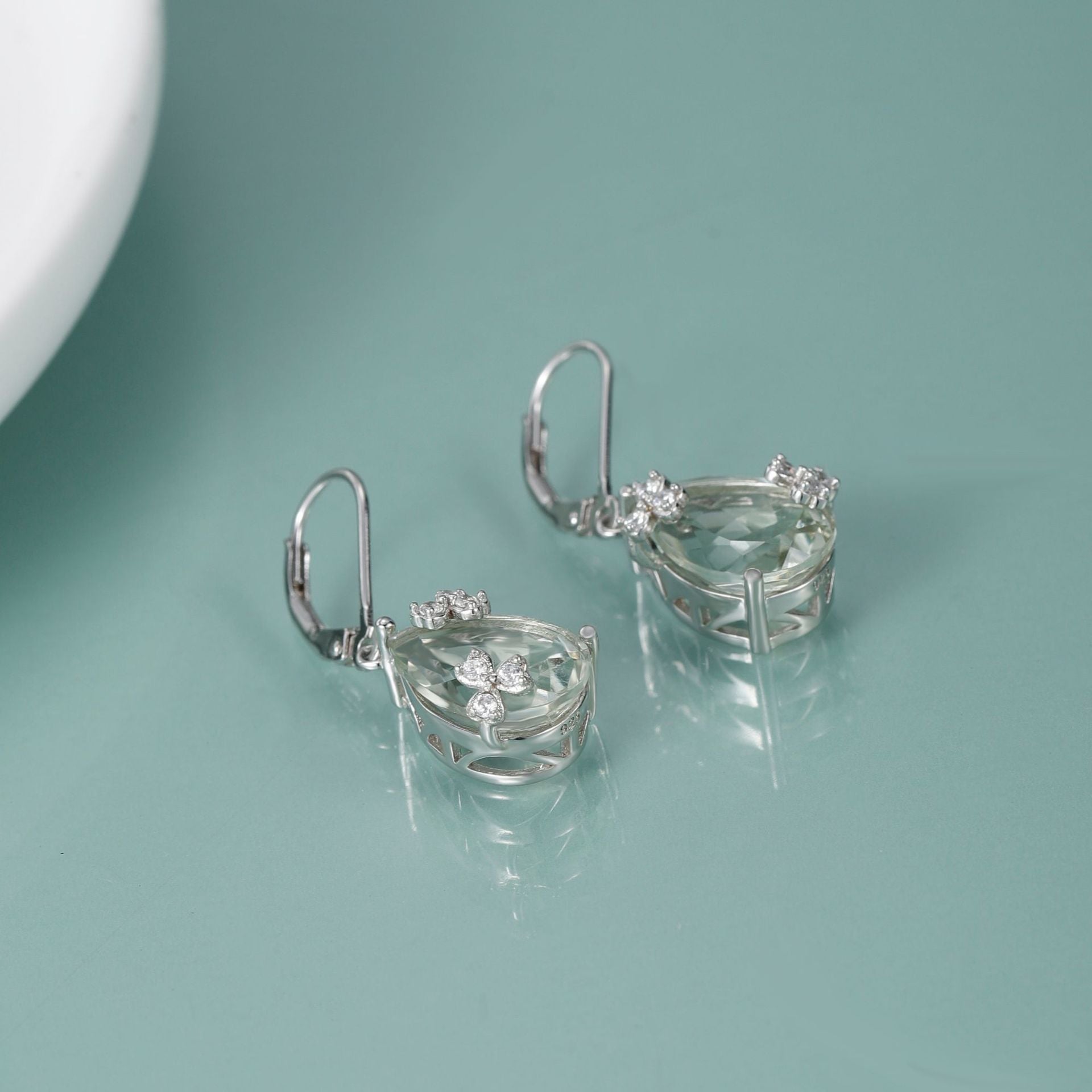 This stunning silver earrings feature a natural cyan pear drop crystal with three-pronged clover design for an elegant look. Ideal for adding a touch of sparkle to any outfit. this earrings make a beautiful gift for her.