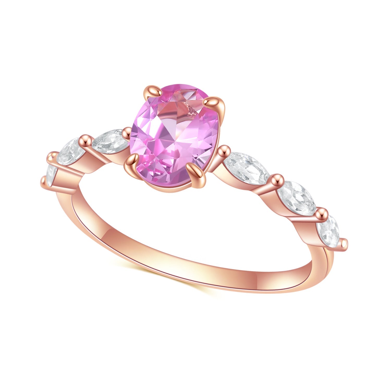 This stunning sterling silver ring features an oval Barbie-Pink Corundum gemstone and decorated with six Marquise Zircon stones on the ring band. plated with a beautiful rose gold finish. Delicate and sophisticated. this ring is perfect for any occasion.