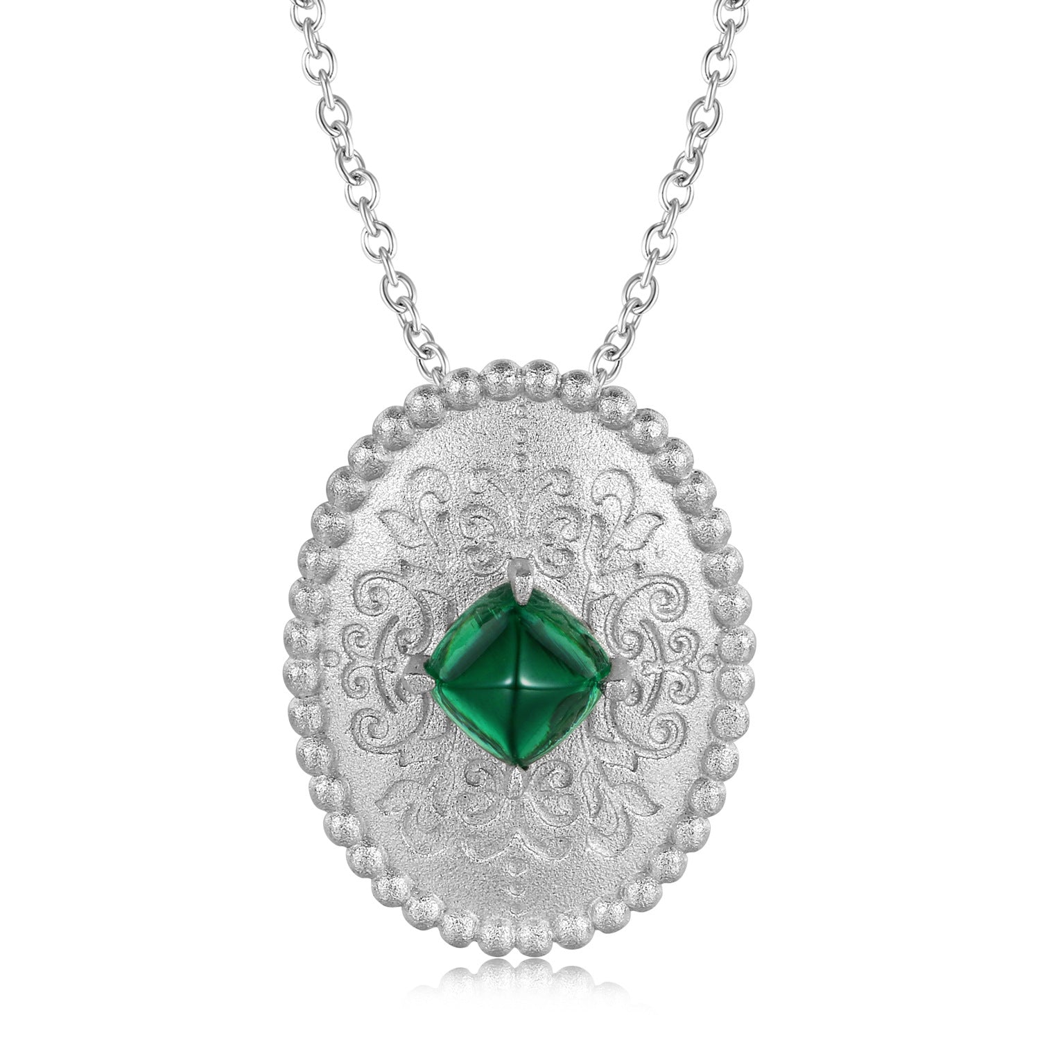 Make a statement with this Sandblasting Retro Pattern Oval Pendant Silver Necklace. The pendant features a square green Zircon in the center for extra sparkle. Crafted out of sterling silver. this necklace is sure to add a sophisticated touch to any ensemble.