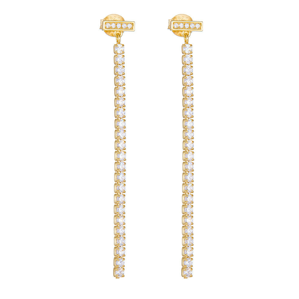 Add sophisticated style to your look with these luxurious Long Tassel Zircon Sterling Silver Drop Earrings. These unique earrings feature a long tassel inlaid with a row of dazzling zircons. Perfect for special occasions. these earrings will add a hint of exclusivity to your wardrobe.