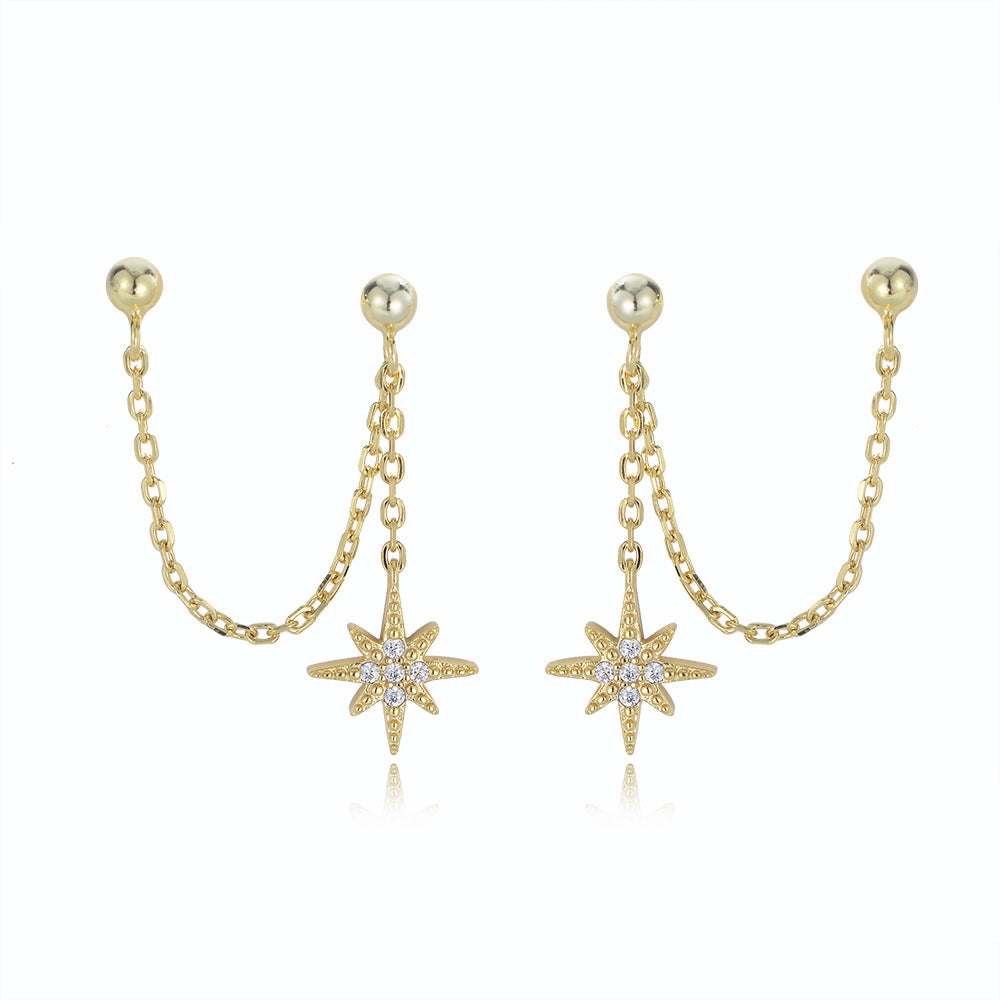 This sophisticated Octagonal Star Double Pierced Chain earrings is crafted from sterling silver. Their unique two connected earring chains design is stylishly decorated with octagonal star for a fashionable look. Add elegance to any outfit with this timeless earrings.
