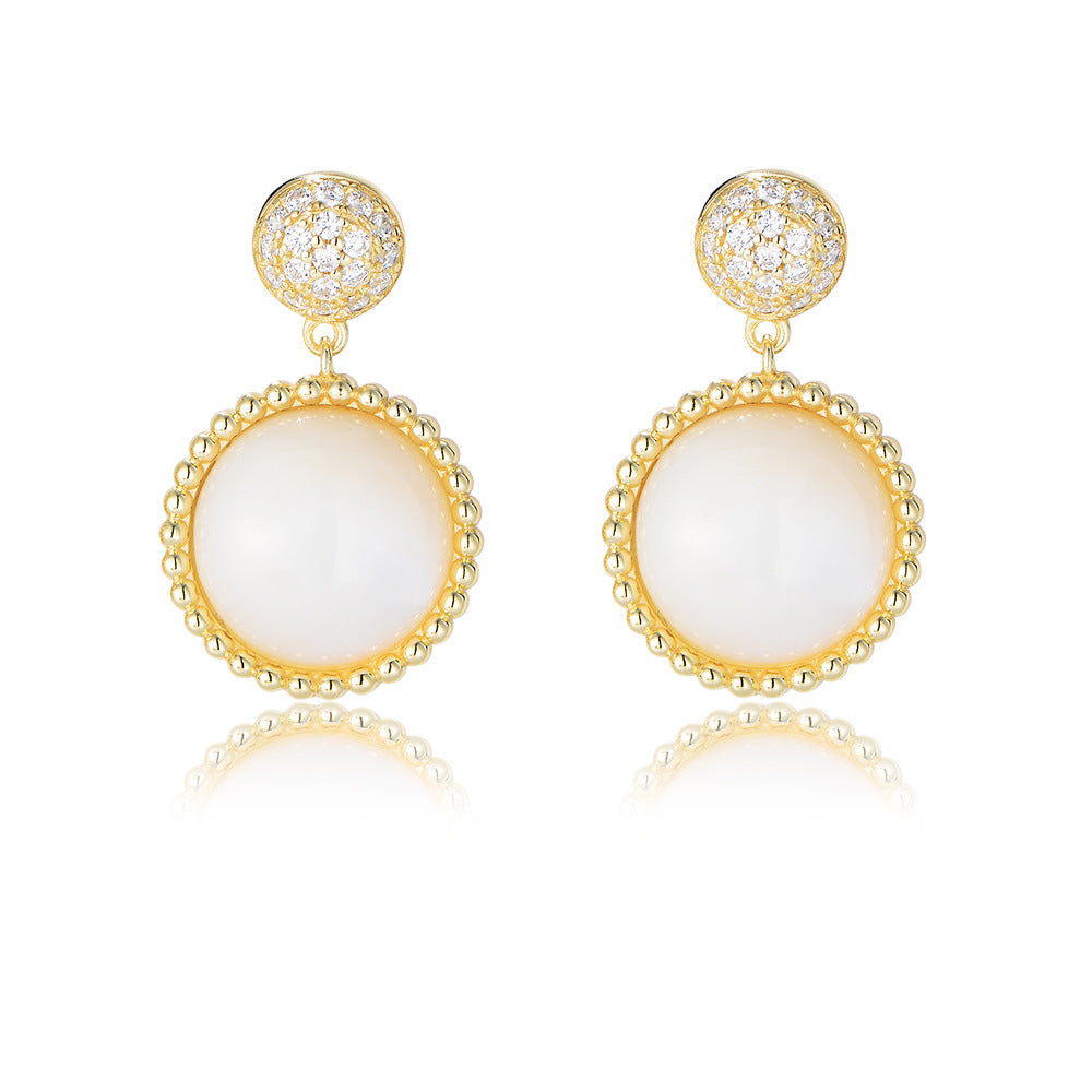 This Round Mother of Pearl with Zircon Silver Drop Earrings for Women are made of sterling silver and feature a timeless and classic design. The stunning round natural Mother of Pearl pendant makes a bold statement. and is complemented with delicate Zircon detailing for a truly beautiful finish.