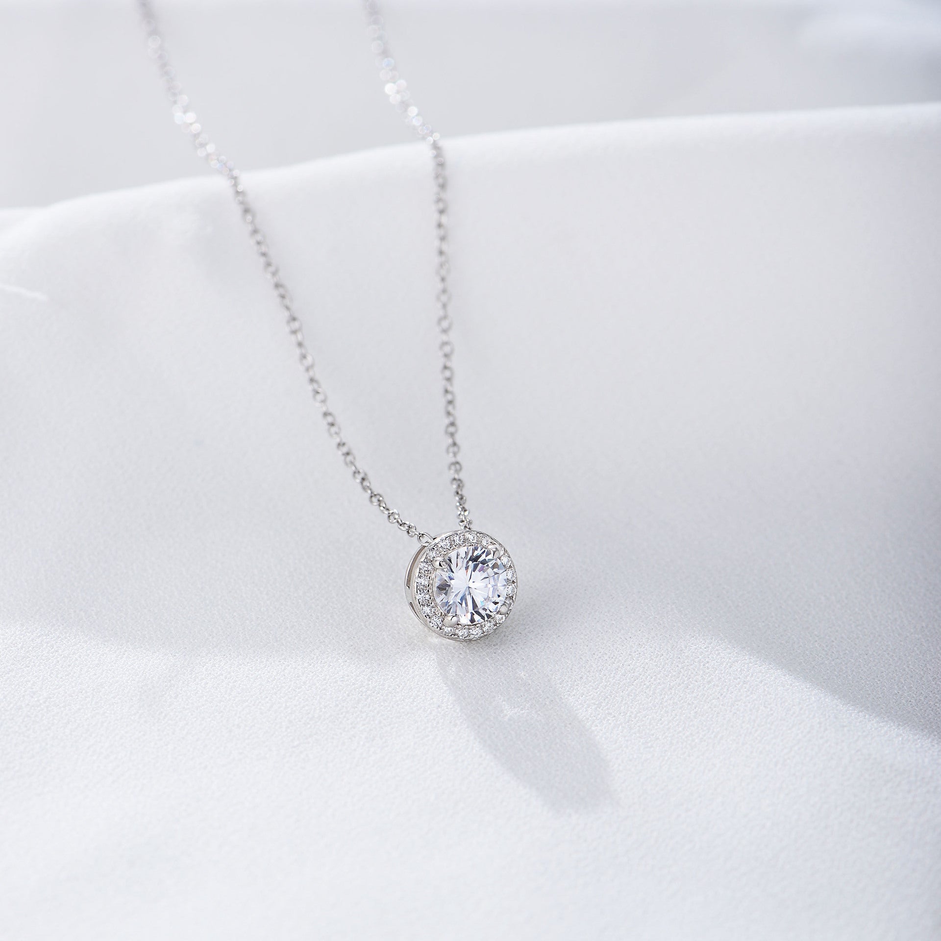 This elegant necklace is designed for any occasions. Crafted from sterling silver and featuring a round cut Zircon decorate with Soleste Halo. it's perfect for making sure you stand out in a crowd. The dazzling Soleste Halo effect offers a unique look that's sure to turn heads.