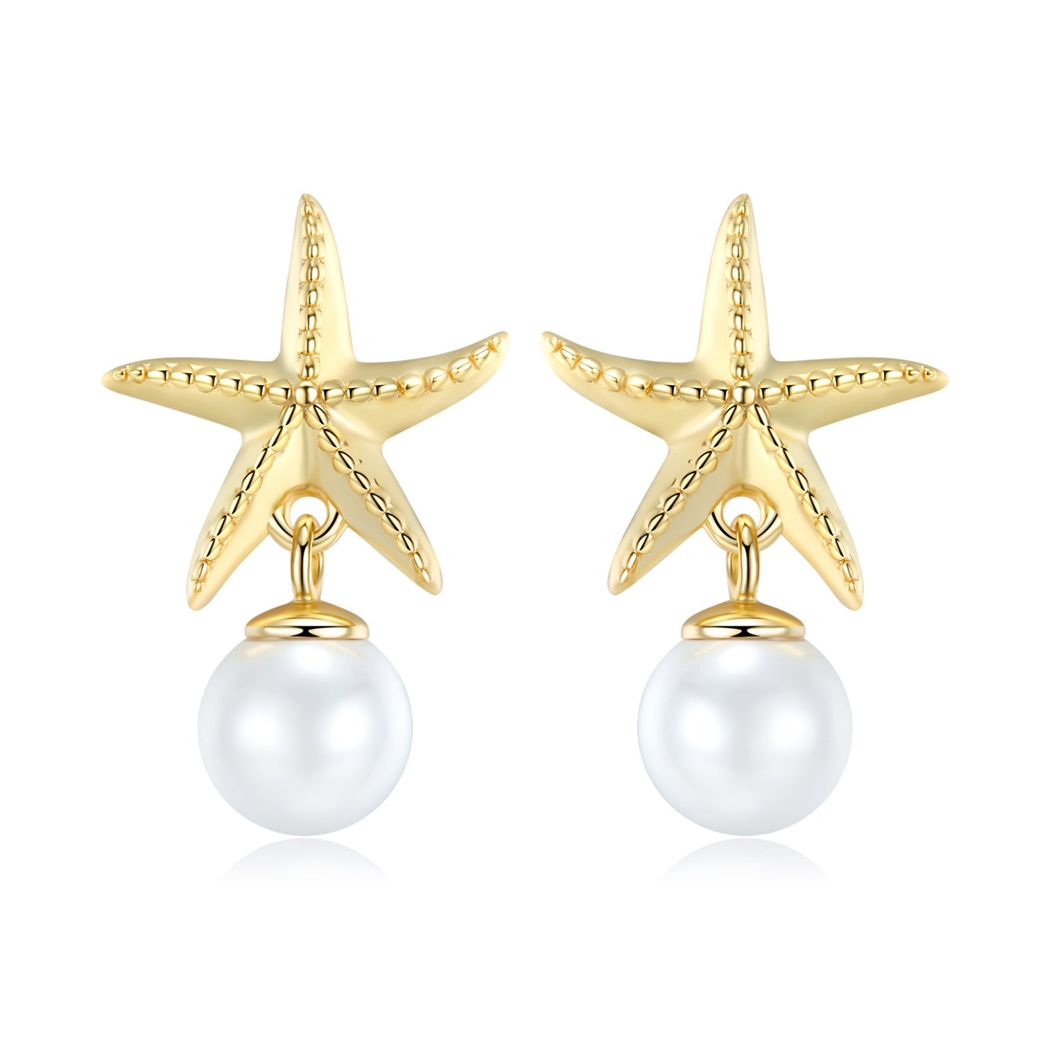 These Starfish Freshwater Pearl Silver Drop Earrings are a modern and chic accessory choice. Crafted with sterling silver and featuring a golden starfish with a round Freshwater Pearl. these earrings are sure to make a statement with any outfit.