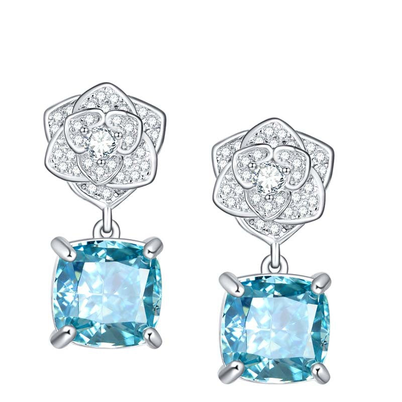 This 8*8mm Cushion Cut Sea Blue Zircon Camellia Silver Drop Earrings offer a classic look with a modern twist.
