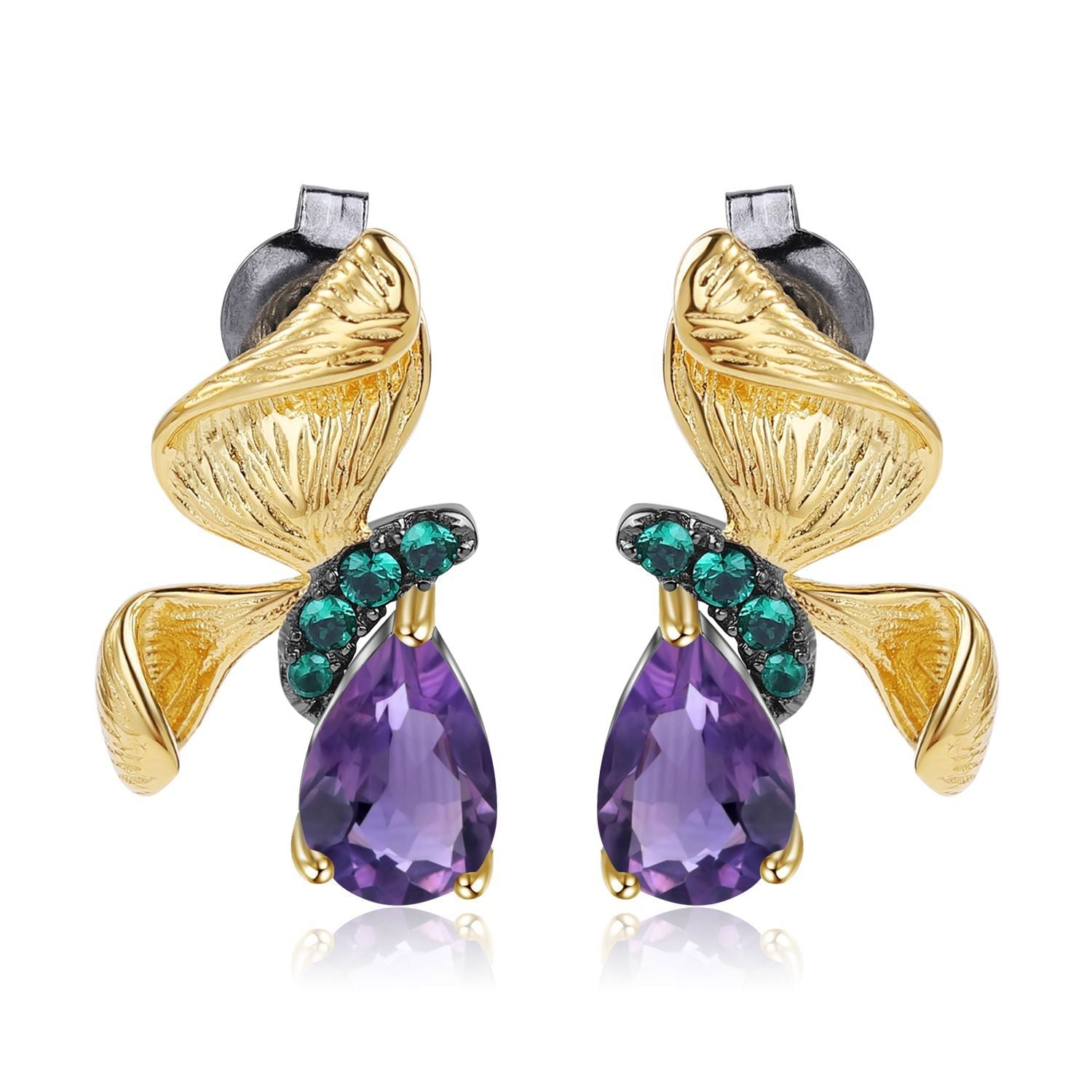 This studs earring is a vibrant and charming accessory with a butterfly theme. symbolizing beauty and freedom. On the earrings. there is a butterfly preparing to fly. Its wings are gilded and sparkling. and its body is inlaid with green crystals. emitting freshness and vitality. The butterfly rests on a pear shaped crystal. which has three colour to choose from. Purple represents nobility and romance. red represents passion and happiness. and sky blue represents tranquility and dreams.