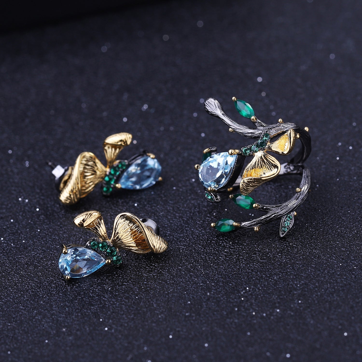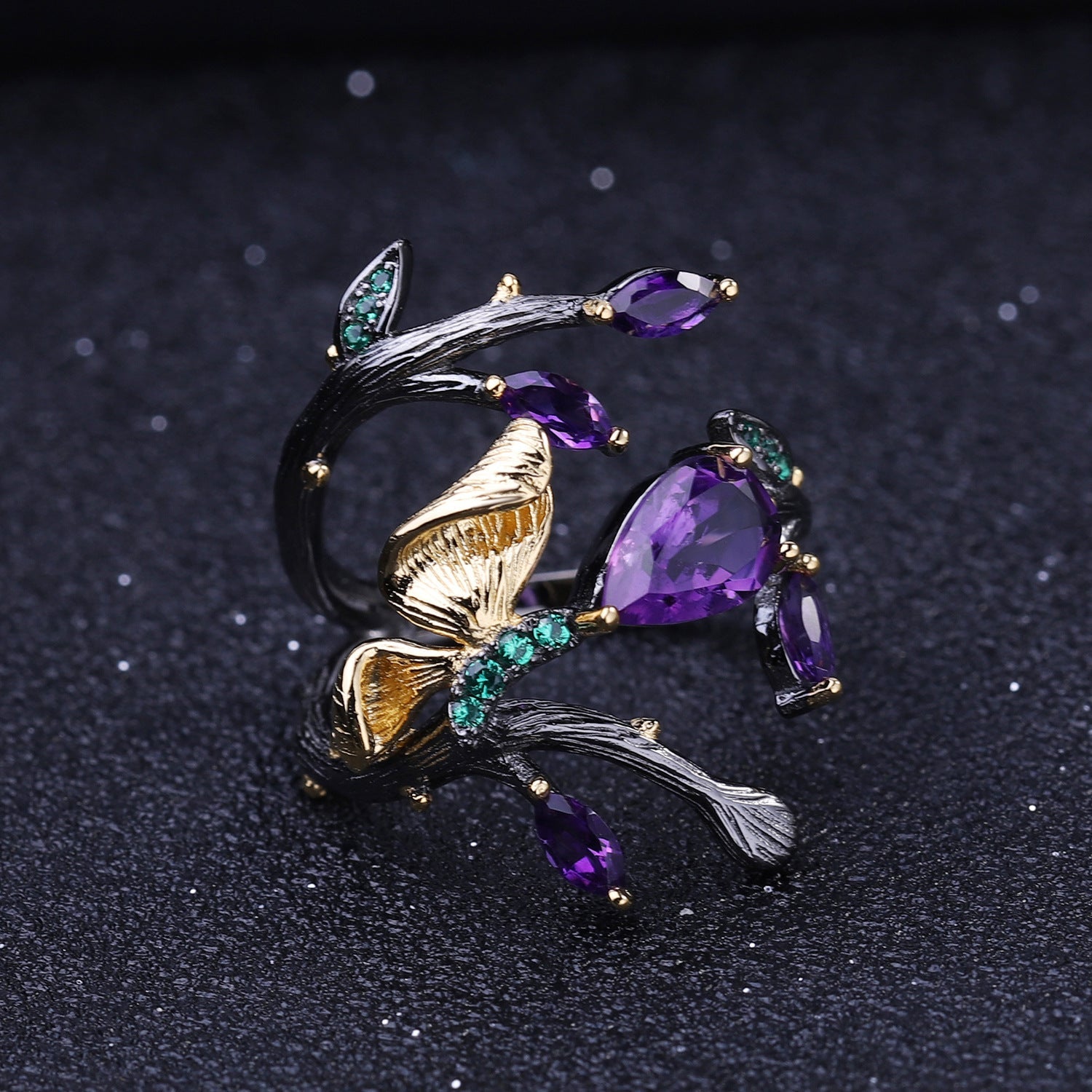 This sophisticated Secret Garden Series ring offers a beautiful and unique rotated garland design that features a butterfly and an array of natural gemstones. as Amethyst. Topaz. Garnet. Crafted of sterling silver. this ring is sure to make a statement with any outfit.