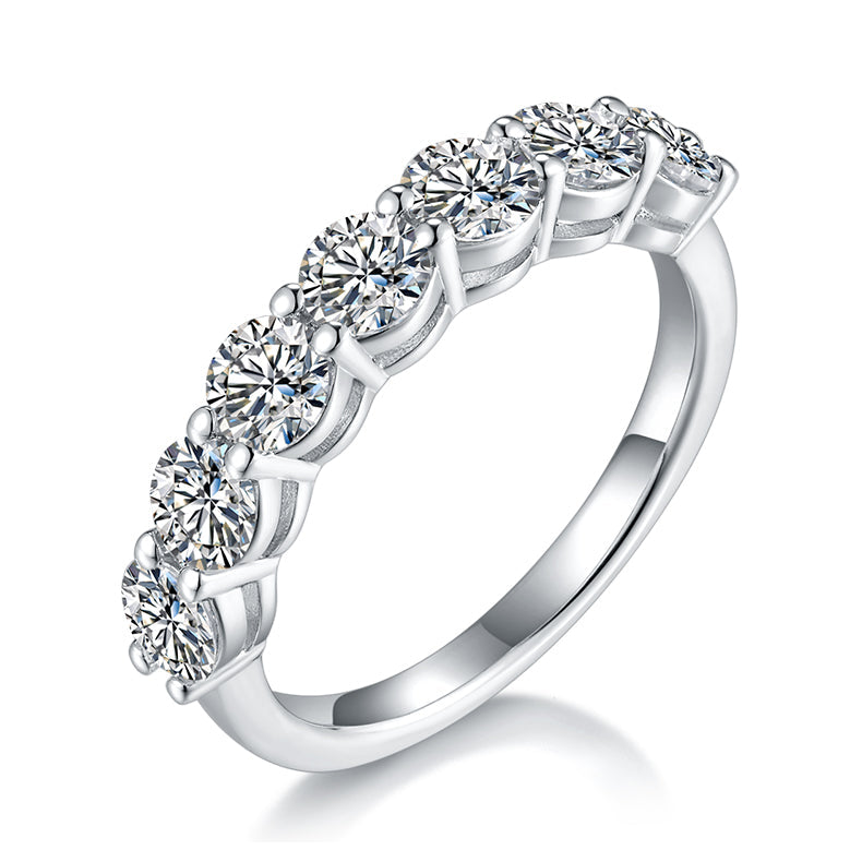 This Seven 2.1 Carat Round Cut Moissanite Ring offers beautiful sparkle and shine. Expertly crafted with seven round cut Moissanite stones. this timeless ring will be sure to be cherished for a lifetime. Enjoy the timeless elegance of this exquisitely crafted ring.