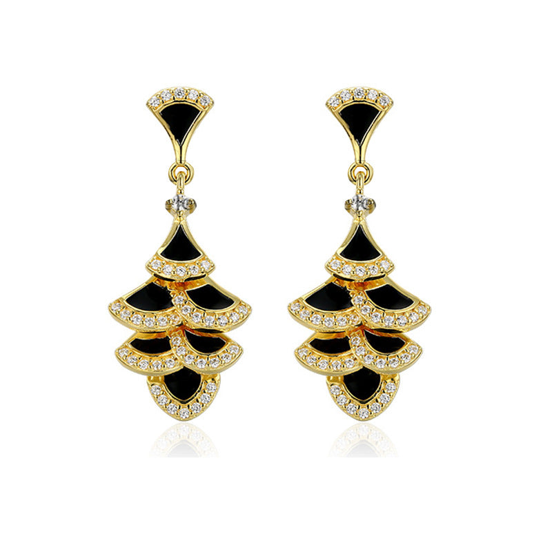 This elegant set of earrings features unique group black fans design with zircons. crafted from sterling silver with a glossy finish. Perfect for special occasions. this earrings showcase a modern design that will easily draw attention.