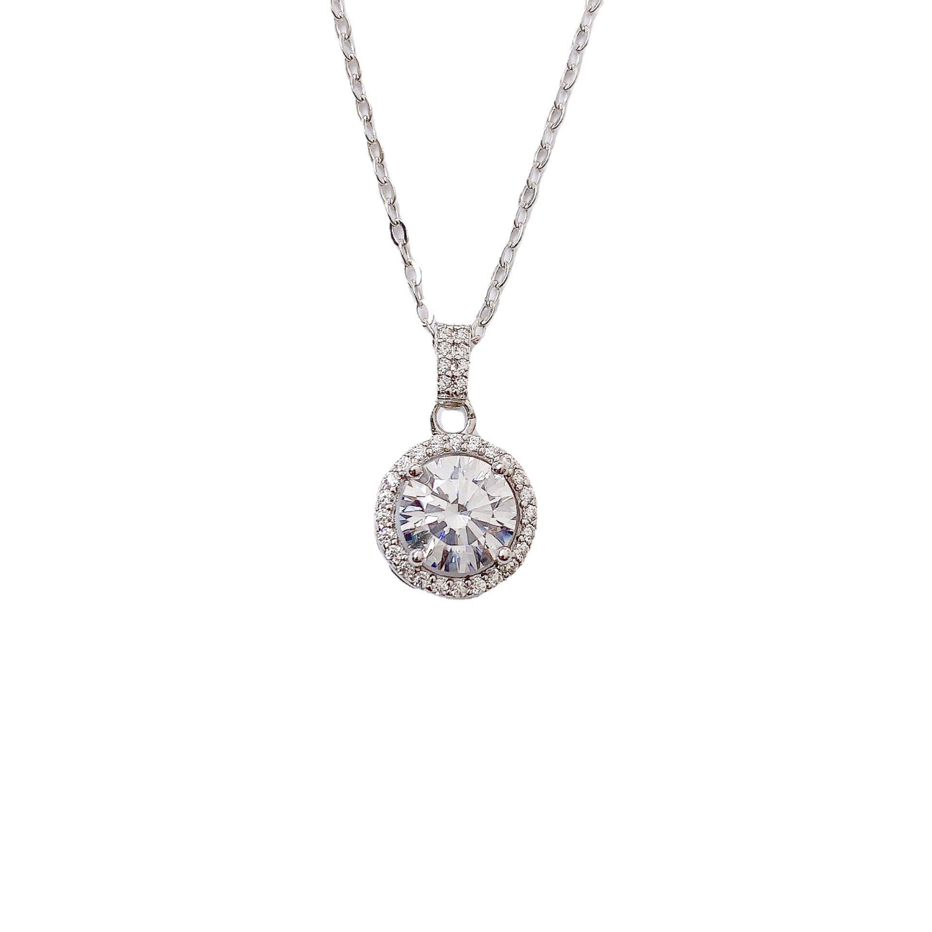 This chic Round Zircon Soleste Halo Pendant Silver Necklace is the perfect accessory for any wardrobe. A dazzling round Zircon pendant is surrounded by a Soleste Halo for added brilliance and sparkle. An exquisite treasure you'll wear for years to come.