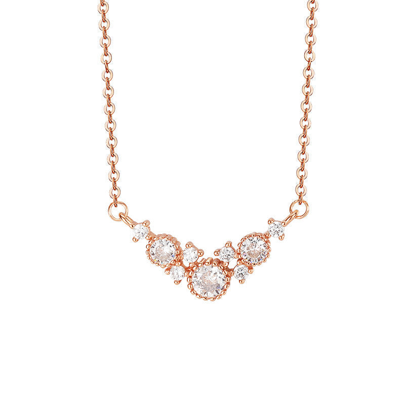 This stunning silver necklace features a stylish V-shape pendant inlaid with different size round Zircon. making it a perfect accessory for any occasion. Showcase your style with this beautiful necklace and add a subtle sparkle to your look.