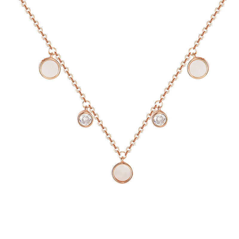 This elegant silver necklace has been crafted with three mother of pearl round pendants and two zircon round pendants beading. providing sparkle and glamor. The Mother of Pearl adds a unique. appealing touch. and the sterling silver construction ensures this necklace will last for years to come.