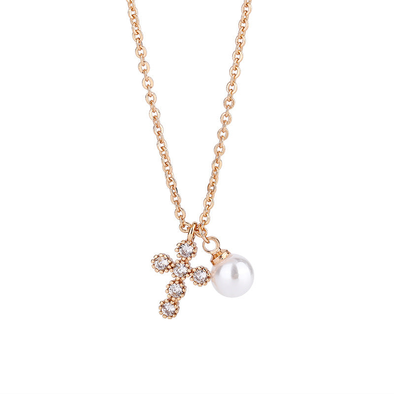 This necklace is the perfect compliment to any outfit. Featuring a pendant of a Zircon cross and a round pearl. Crafted in sterling silver plated in rose gold. it makes a subtle yet stunning statement. Its classic. sleek design ensures it won't date or go out of fashion.