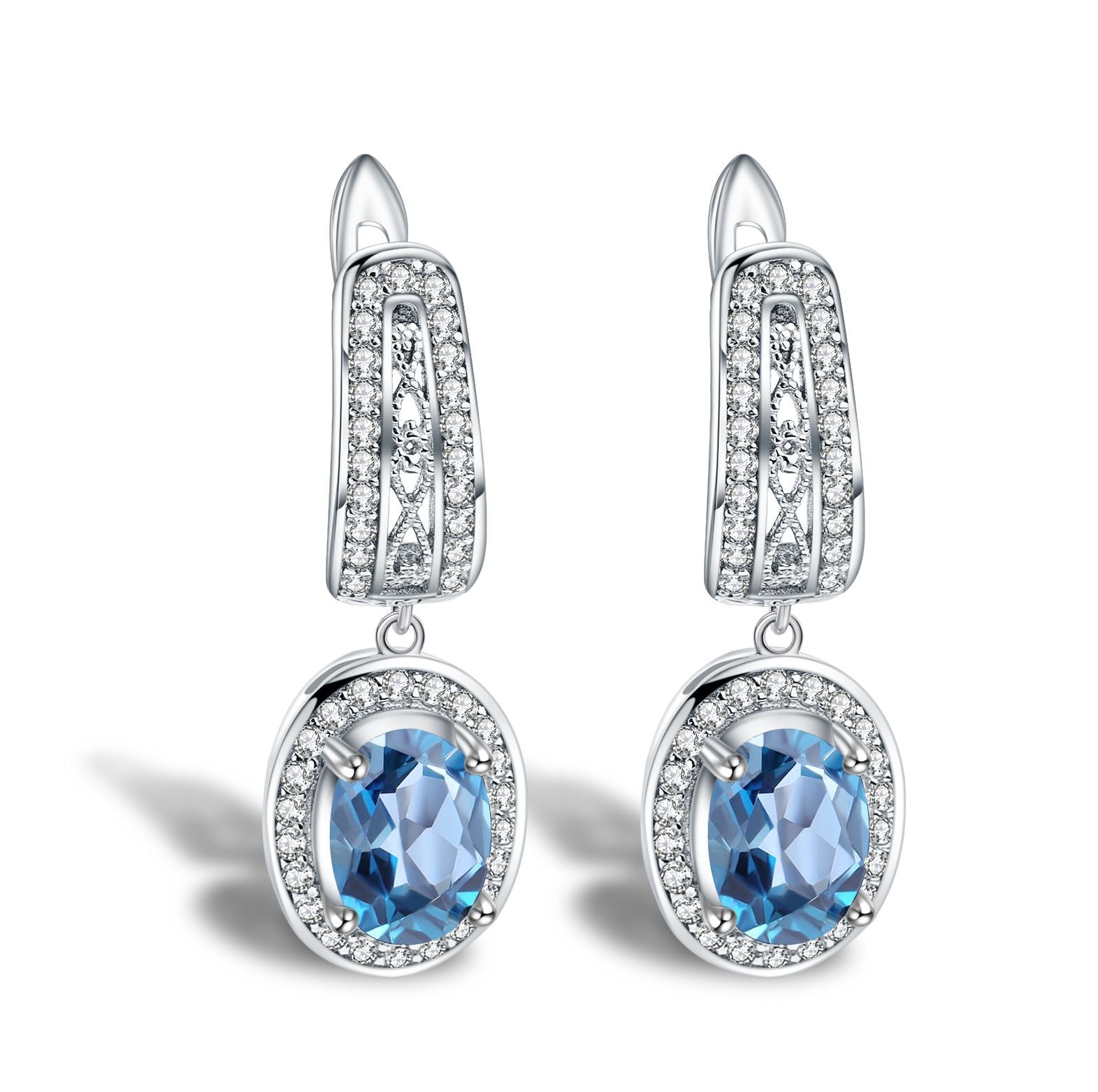 This European style drop earrings is adorned with a oval shape natural blue topaz pendant. Crafted in sterling silver. they are perfect for adding a touch of elegance to any look. Ideal for the modern woman. the eye-catching Soleste halo design will make you shine.
