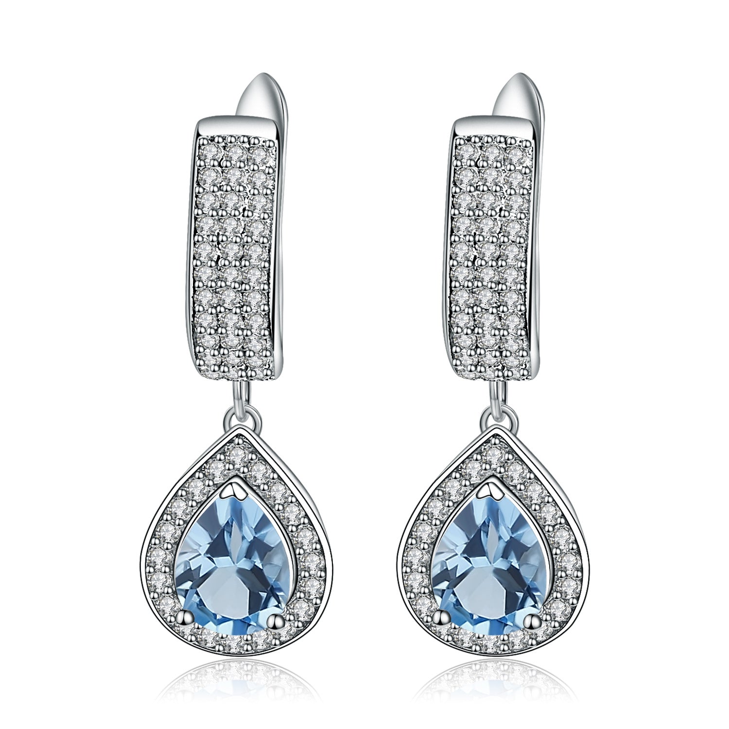 This exquisite European style earrings feature a pear-shaped topaz with soleste halo and crafted in sterling silver. Perfect for a special occasion. this earrings are sure to add sparkle and elegance to your look.