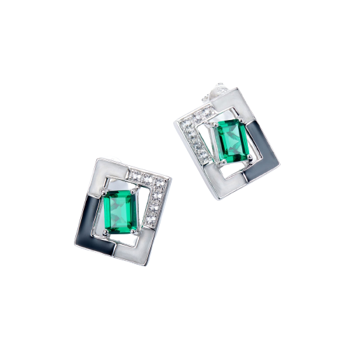 These beautiful earrings feature an elegant combination of black and white enamel and a shining rectangle green zircon. Crafted in sterling silver. these earrings is the perfect accessory for any occasion.