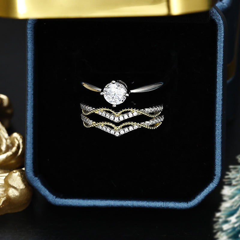 This Round Zircon Solitaire with Interweave V Shape Three-in-one Silver Ring Set offers a sophisticated look with its three-in-one design. One features a round-cut zircon for a timeless look. while the two accompanying unique interweave V-shaped rings are intricately decorated with small zircons for added sparkle.