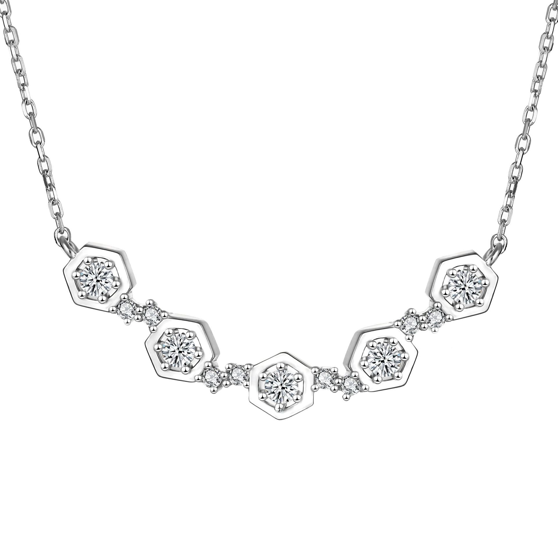 This stylish sterling silver necklace features a row of honeycomb pendants. that adorned with round zircons. The intricate honeycomb design and sparkling zircons make for a unique and elegant piece of jewelry. Perfect for adding a touch of sophistication to any outfit.