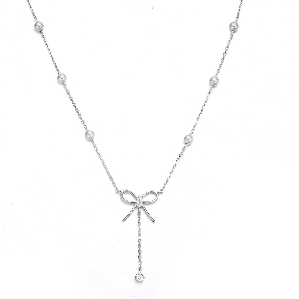 This chic bowknot pendant necklace for women is adorned with a round Zircon and delicate beading . The natural pearl adds a unique touch of elegance to any outfit. Perfect for formal events and special occasions.