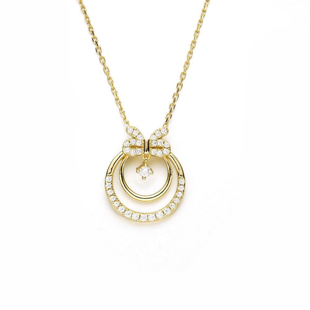 This elegant double circle pendant necklace features a chic bowknot design with zircons. Perfect for formal occasions or everyday wear. its slim collarbone style will flatter any look. You can wear it alone or pair it with other necklaces for a unique. layered effect.