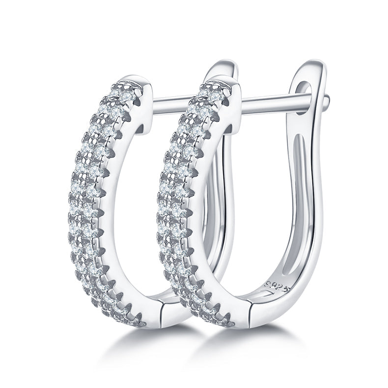 These U Shape Double Half Row Moissanite Hoop Earrings are the perfect accessory for any occasion. With half double row of 0.28 carat Moissanite stones set in a solid silver hoop. these earrings are as sparkly as they are stylish. The timeless design maximizes the brilliance of these beautiful Moissanite stones. ensuring you're always looking your best.