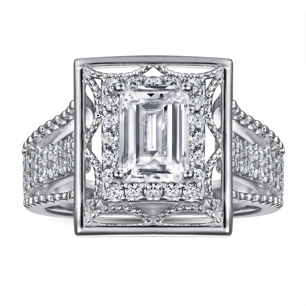 This stunning Sumptuous Rectangle with Emerald Cut Zircon Vintage Silver Ring offers a touch of refined elegance. The sumptuous rectangle shape is highlighted with a dazzling emerald-cut zircon in the center for a classic look that sparkles with sophistication. The modern split shank ring arm is decorated with additional zircons for a truly luxurious finish. Capture timeless beauty with this exquisite vintage sterling silver ring.