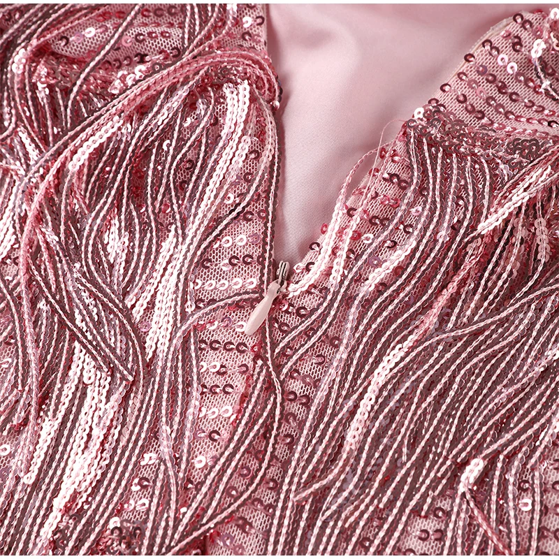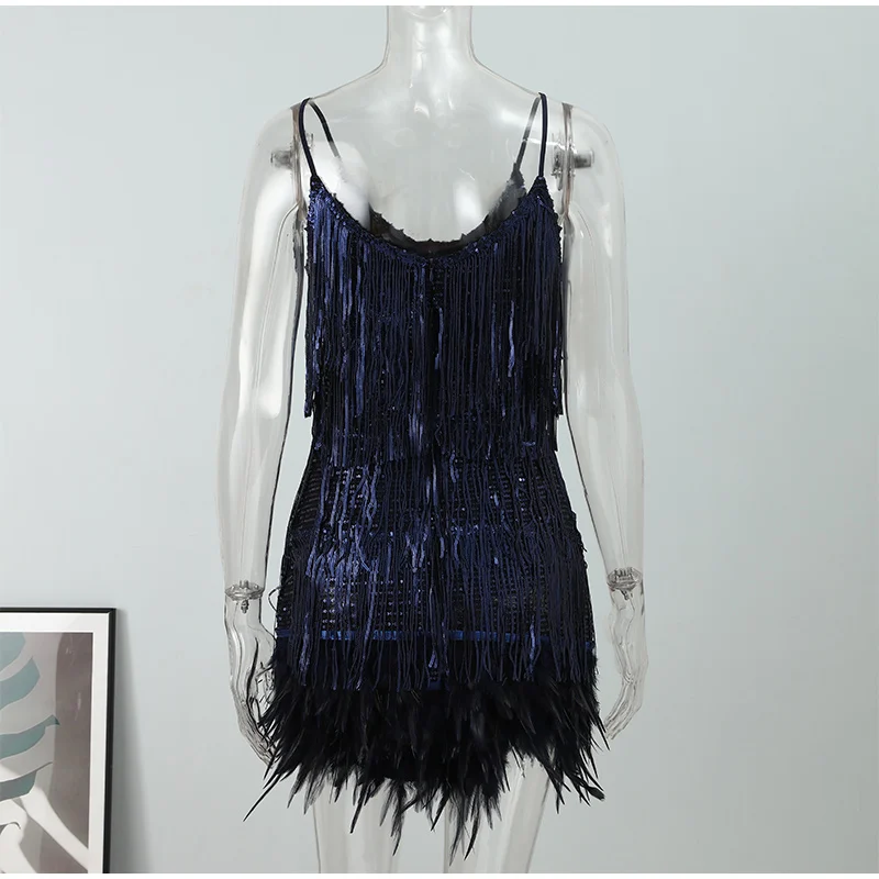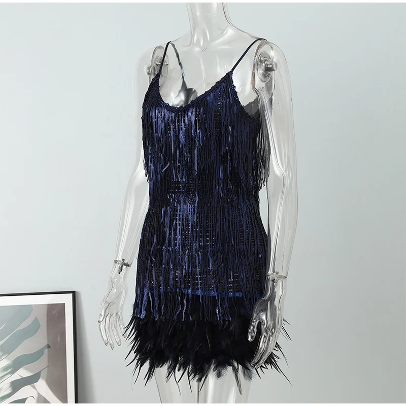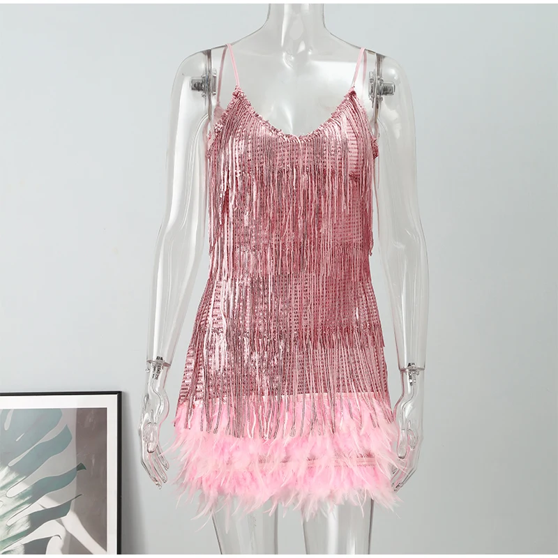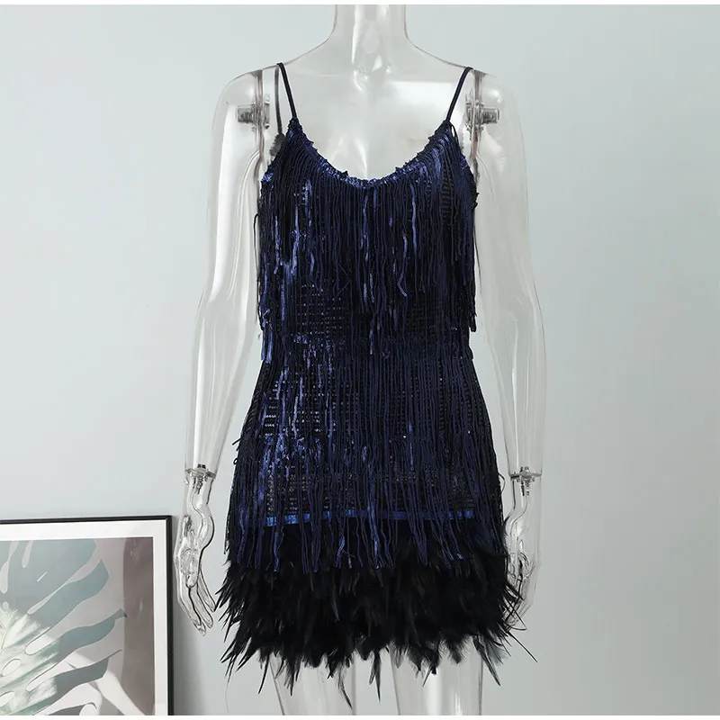 Sequins Tassel Feather Spaghetti Strap Dress Women Fashion Sexy Stitching Mini Dress Evening Party Club Elegant Dress