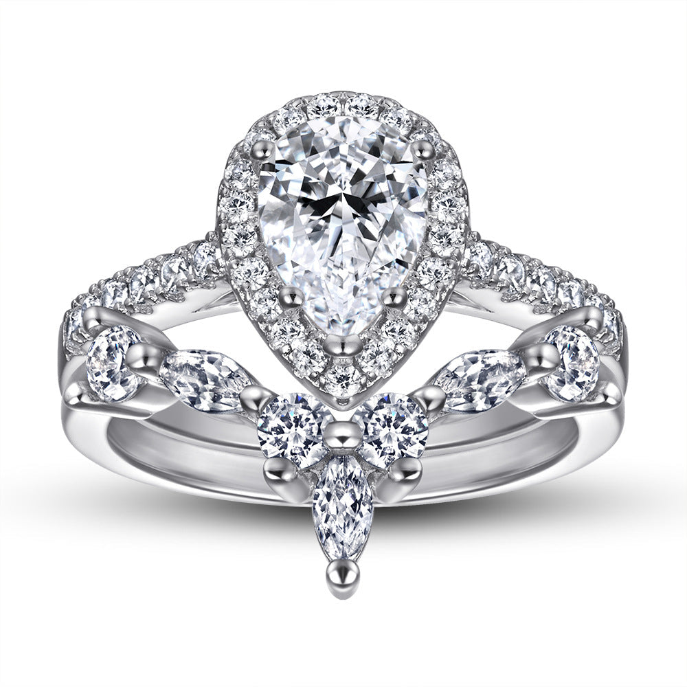 This elegant Water Drop Zircon Soleste Halo with V-shape Silver Ring Set is a perfect choice for your special day. One ring features with a Water Drop Zircon with Soleste Halo and another ring with a unique V-shape composed of different shape zircons. Both rings are sure to make a statement and have you shining.