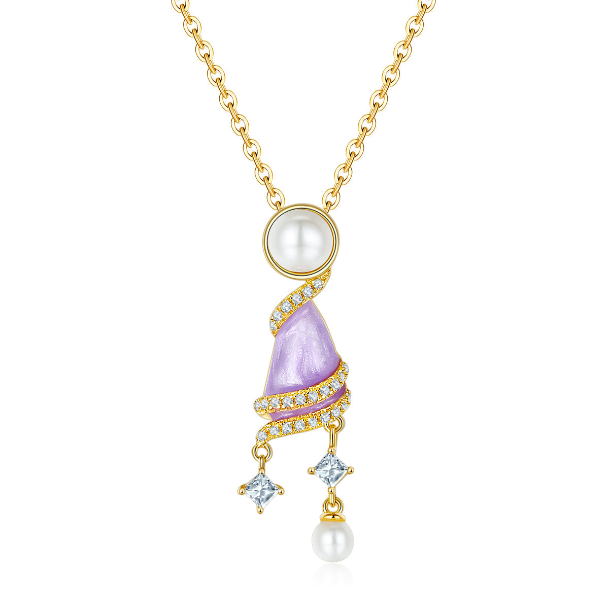 This beautiful necklace features an elegant purple enamel Wind Chimes pendant adorned with pearl and small zircons. An ideal gift for any woman. this necklace is made with quality sterling silver plated in gold. ensuring a timeless look.