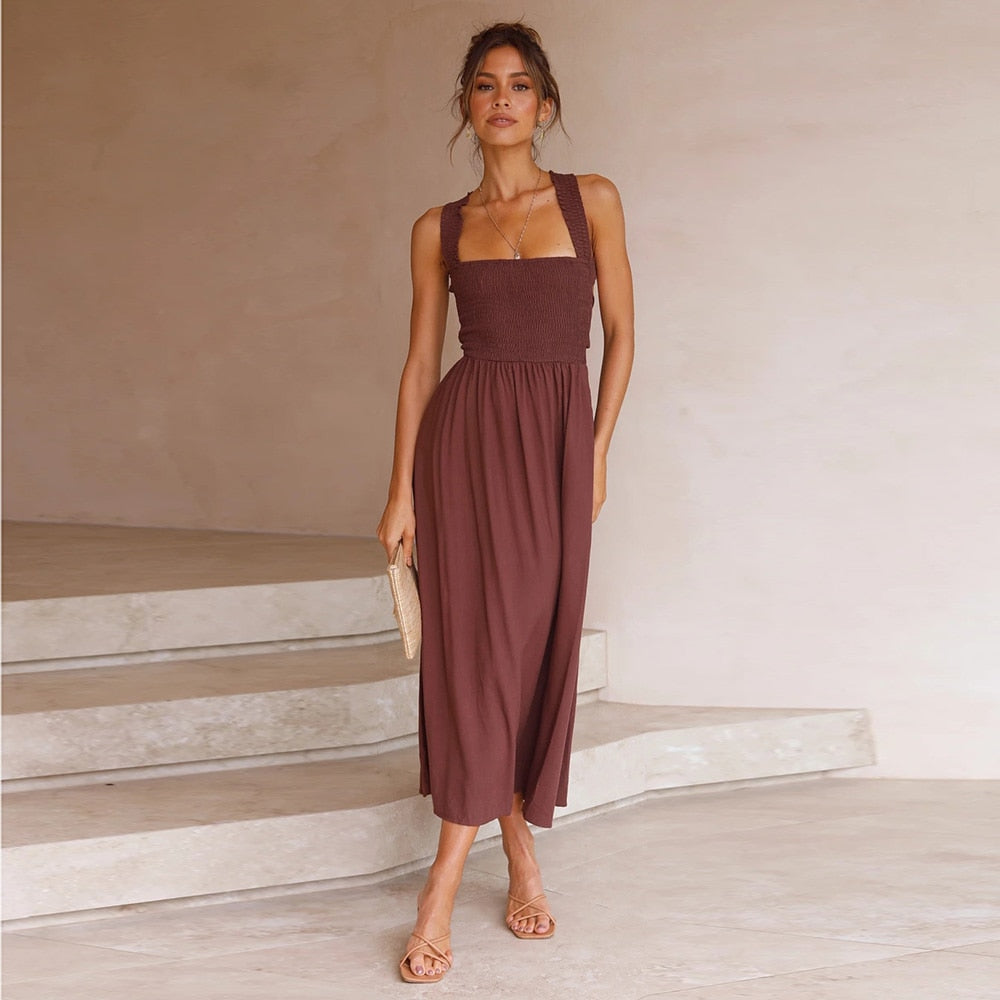 Women Cross Bandage Midi Dress Summer New Sexy Backless Solid Color Bow Casual High Waist Black Stretchy Party Holiday Vestidos