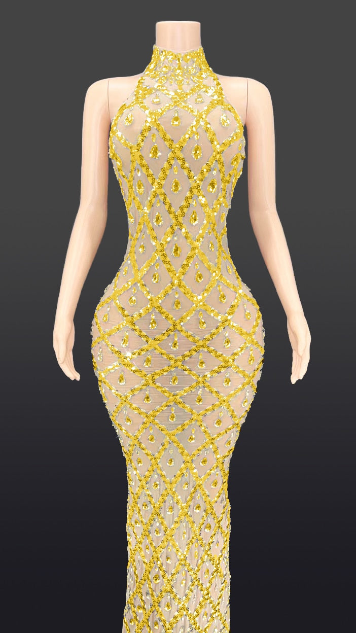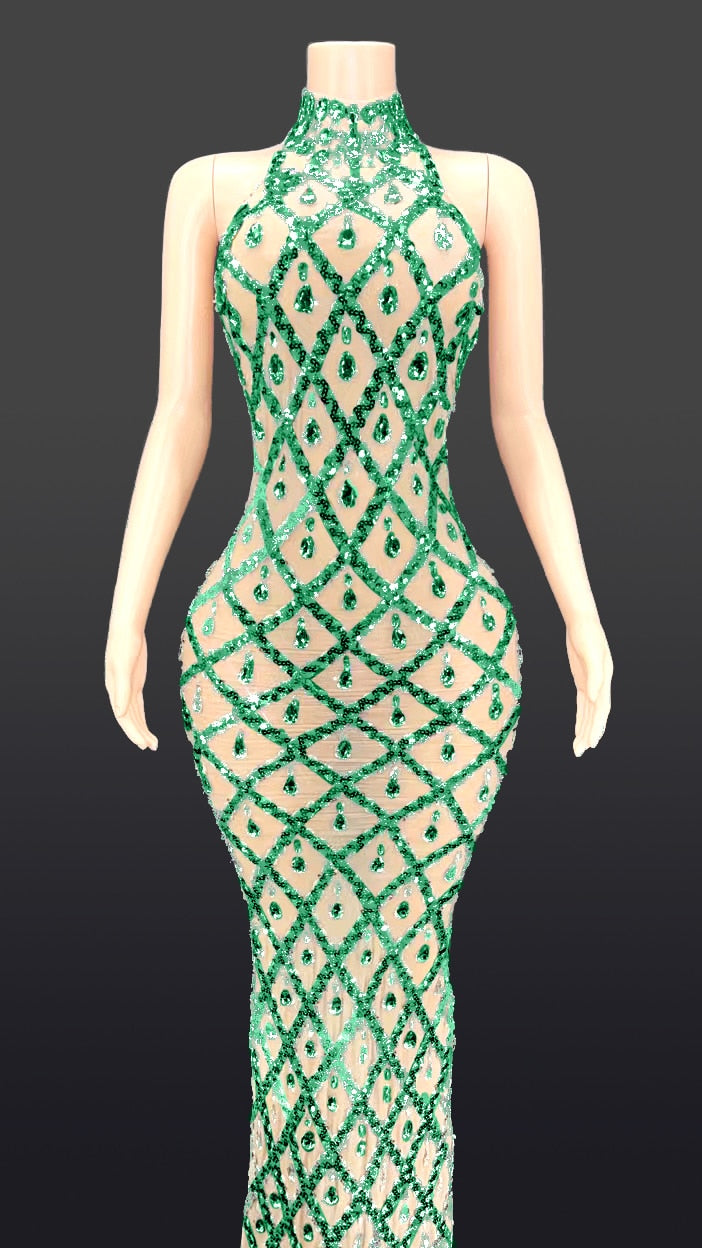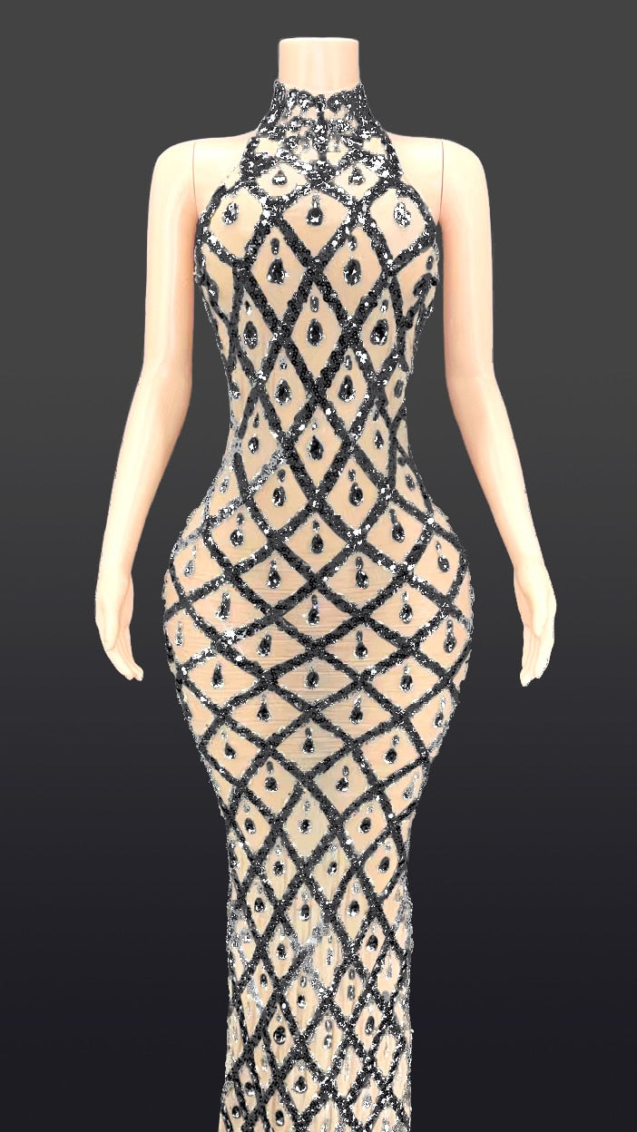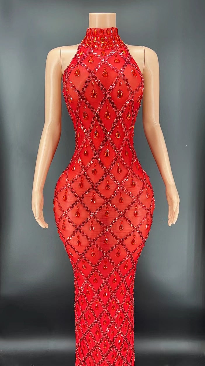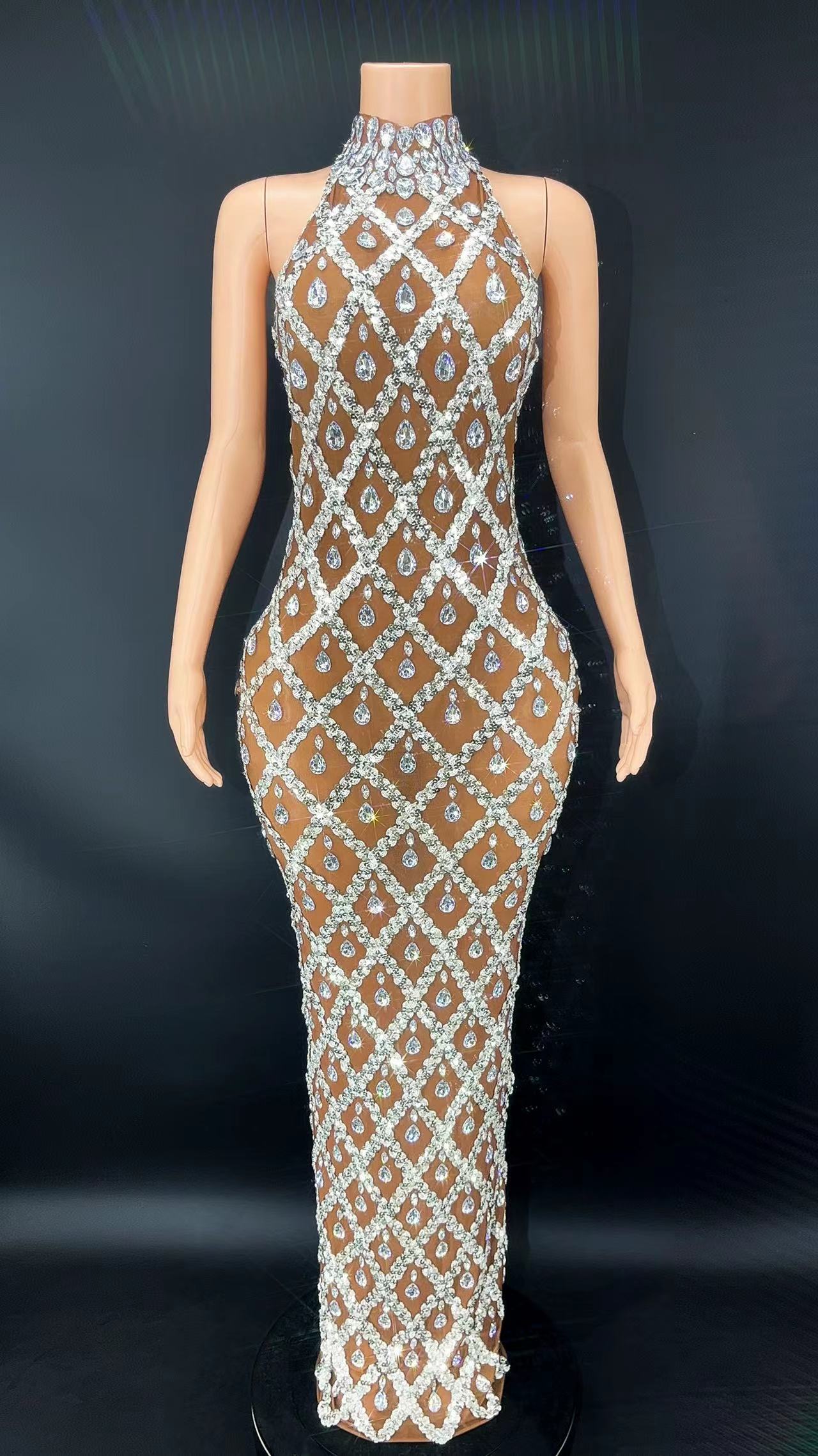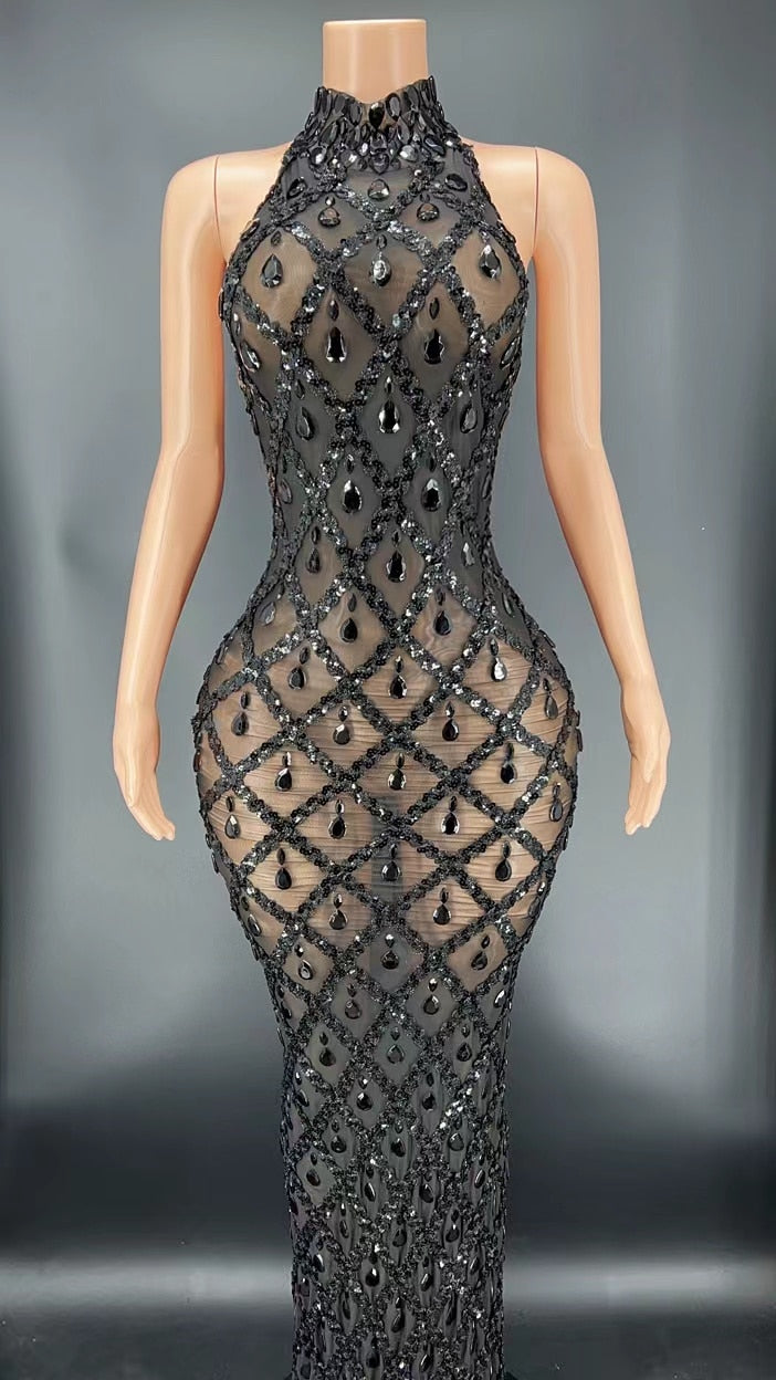 Women Sexy Stage Shining Rhinestone Sequins Dress Evening Prom Birthday Dress Transparent Performance Singer Club Host Dress