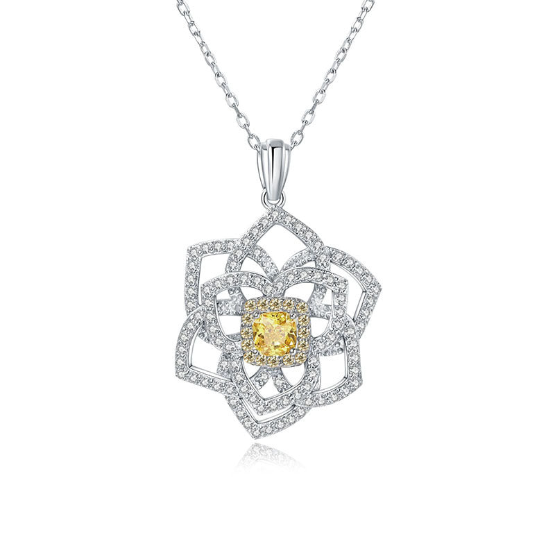 This beautiful Roses Cushion Cut Yellow Zircon Silver Necklace is the perfect finishing touch to any look. Showcase an elegant hollow rose pendant decorate with a unique 4*4mm cushion cut yellow zircon in the center for added sparkle. This necklace offers a timeless and elegant way to accessorize and make any outfit stand out.
