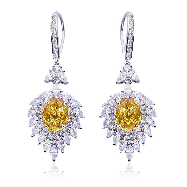 The earrings are adorned with a 4.0 carat yellow oval shaped zircon. surrounded by a leaf shaped halo of white zircons. resembling a blooming flower. Yellow zircon emits a charming glow. symbolizing fortune and luck. and can bring confident and hope to the wearer. White zircon symbolizes purity and beauty. adding a sense of sophistication and flexibility to the earrings.
