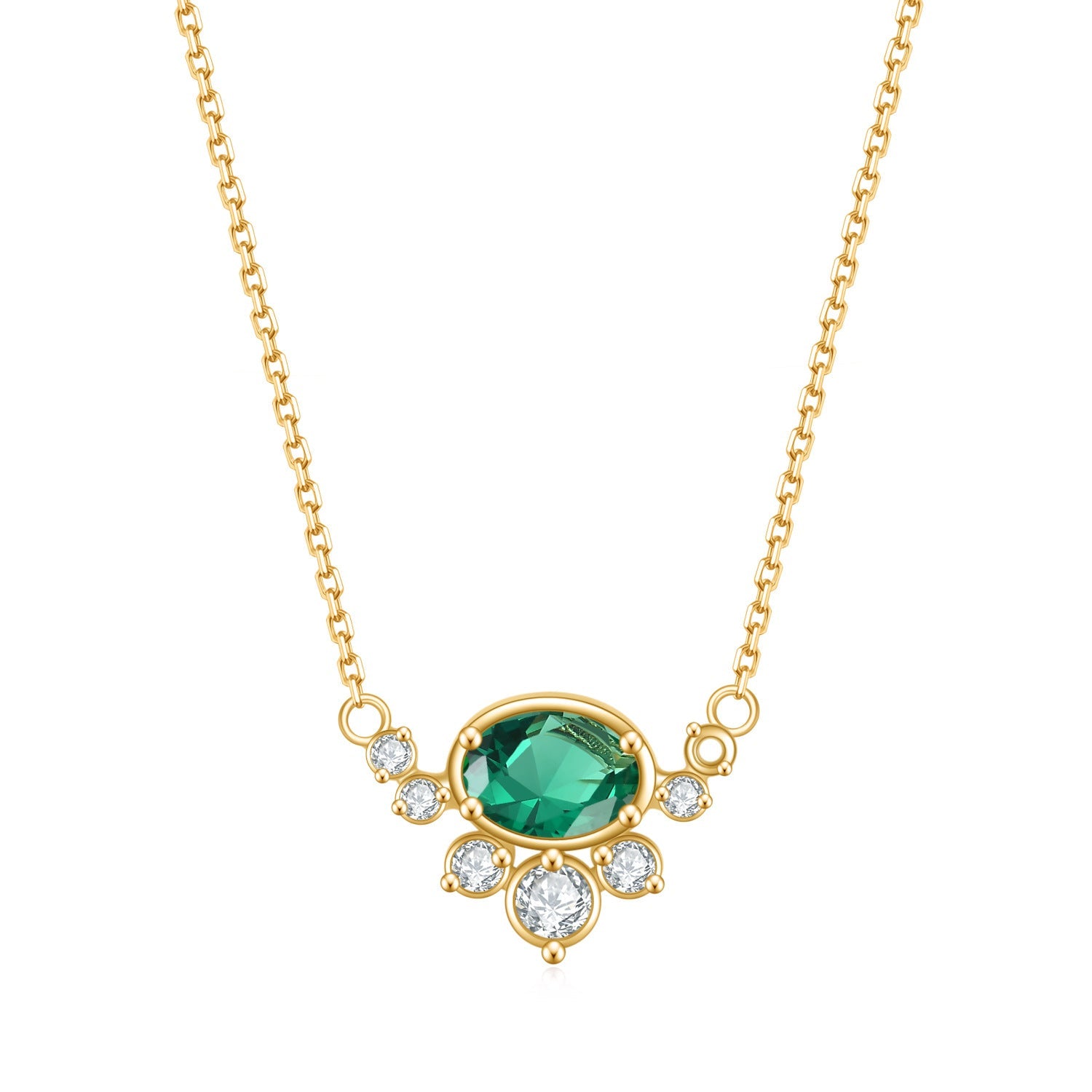 Charm in style with this high quality Emerald Nanometer oval shape stone pendant. Crafted with sterling silver and plated in gold. this necklace is sure to draw attention with its grace and elegance.