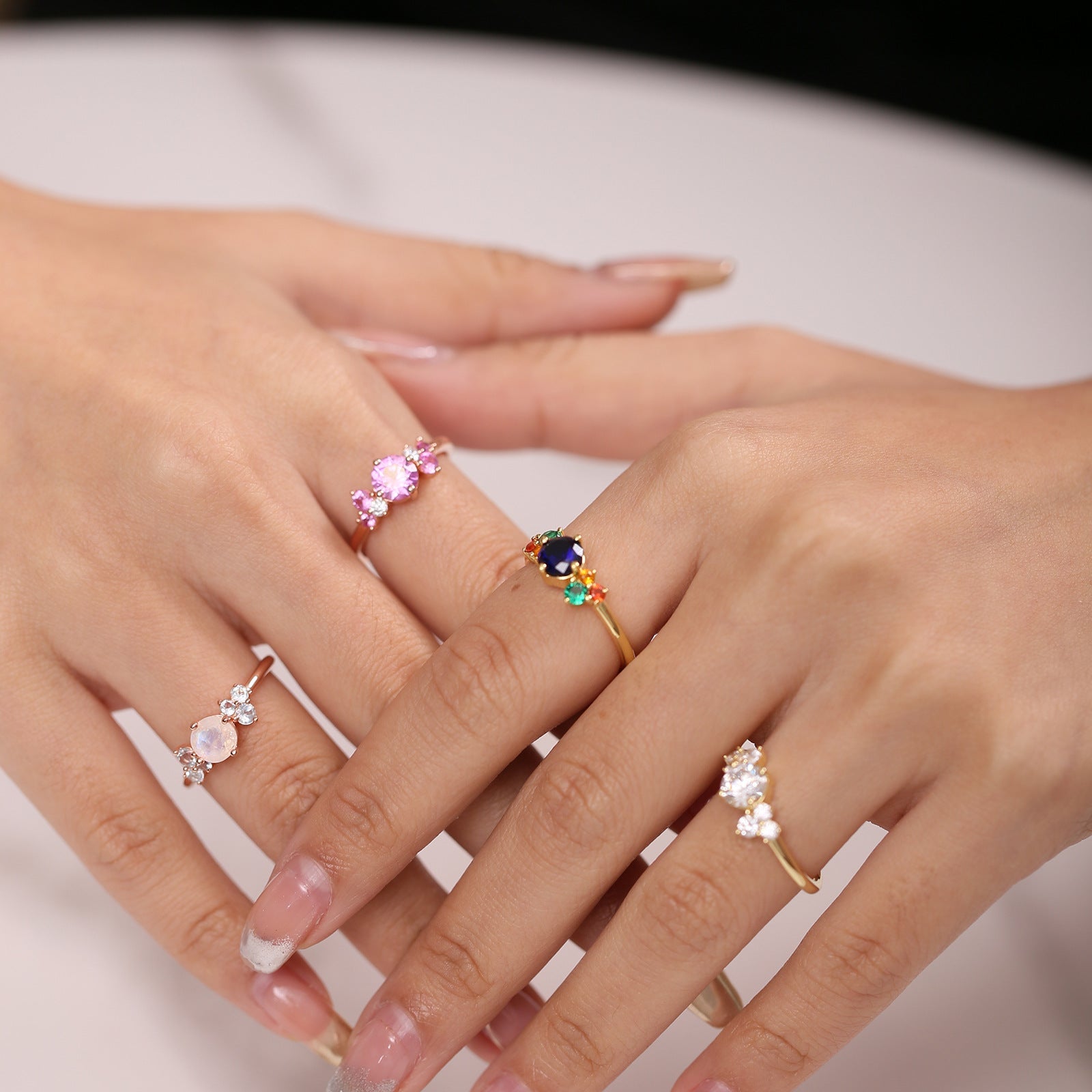 This elegant Round Cut Natural Moonstone Silver Ring features a dazzling round shape Moonstone in center. meticulously framed by six small round blue zircon on the ring arm. Crafted from sterling silver plated in rose gold. this timeless and beautiful ring is sure to make a statement.