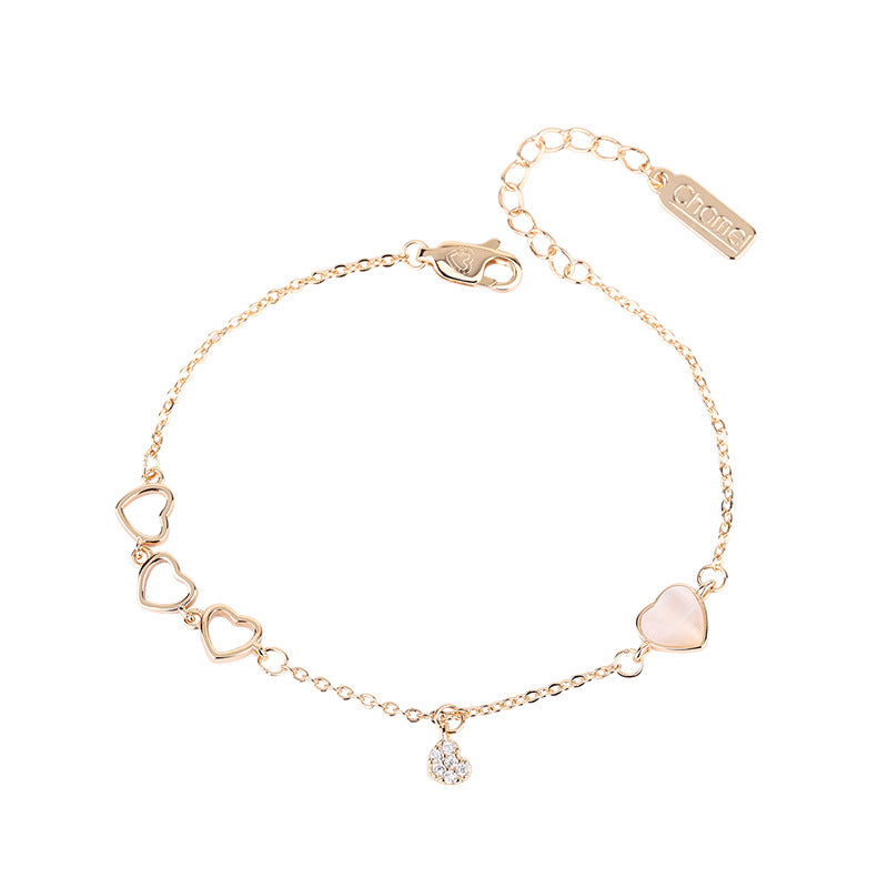 This charming bracelet is an elegant addition to any outfit. Made of sterling silver and featuring a Heart-shaped Mother of Pearl and a heart-shape Zircon. this timeless piece is made even sweeter with three delicate hollow hearts. Crafted with love. it's sure to make a unique and special gift.