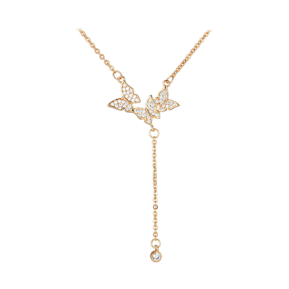 This elegant necklace features a pendant of three zircon butterflies adorned with an elegant tassels. for a feminine and delicate look. Crafted with premium materials. this necklace is sure to make a statement.