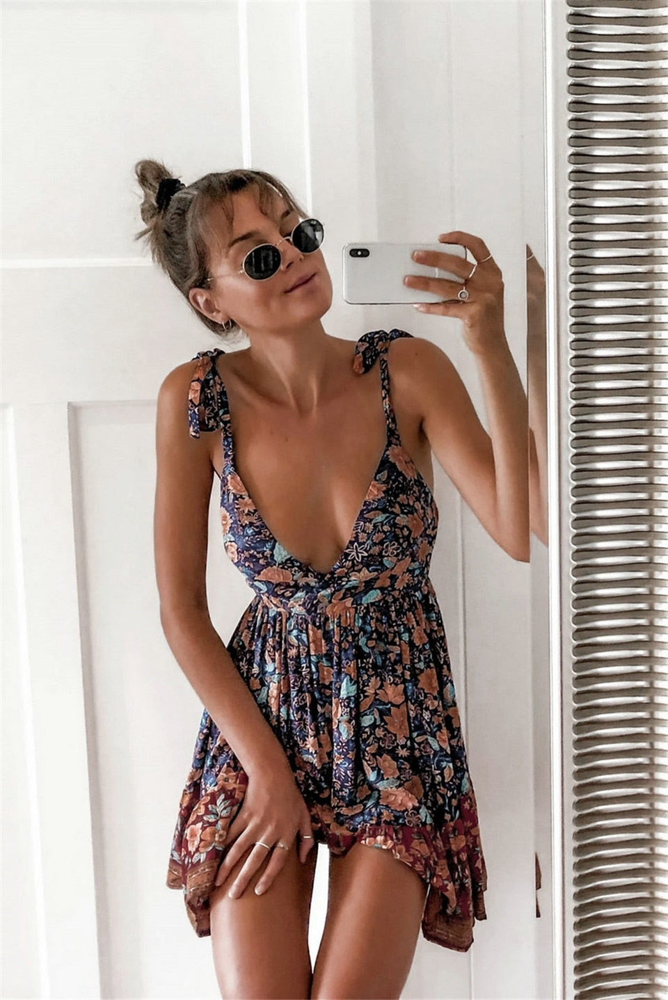 Hoobd Bohemian Style Women Summer A-Line Dress Bandage Design Sling Sleeveless V-Neck Backless Leopard Flower Print Slim Mini Dress